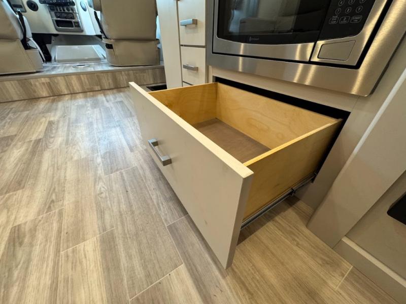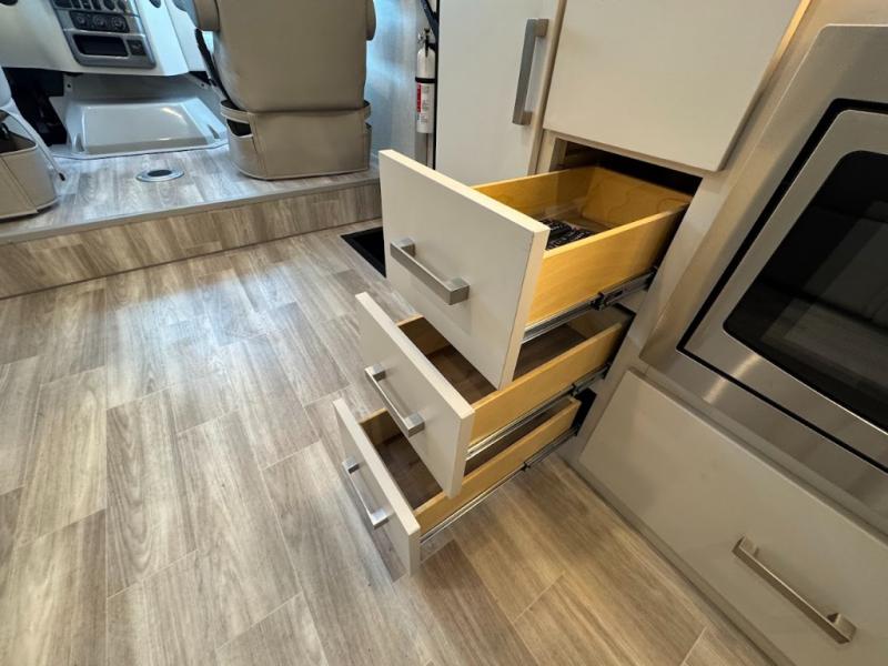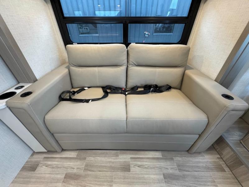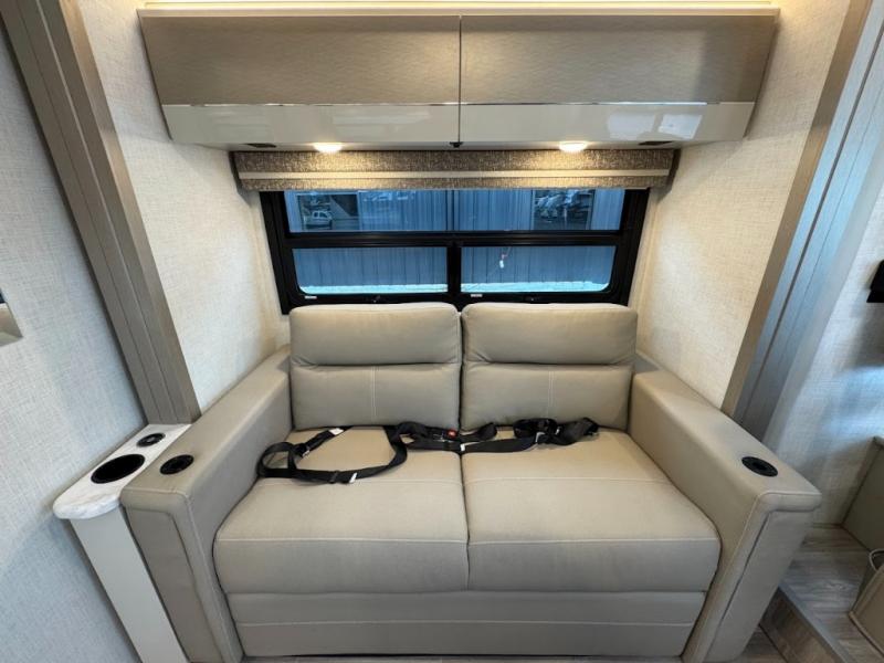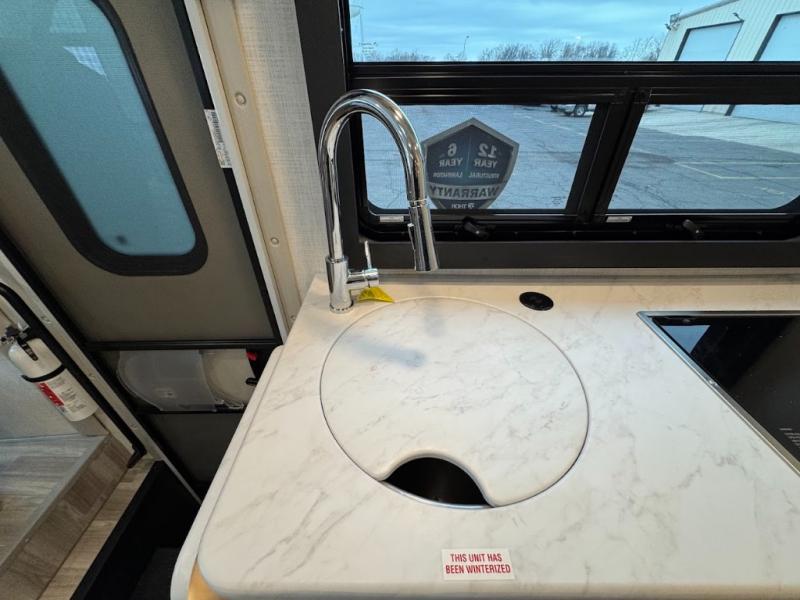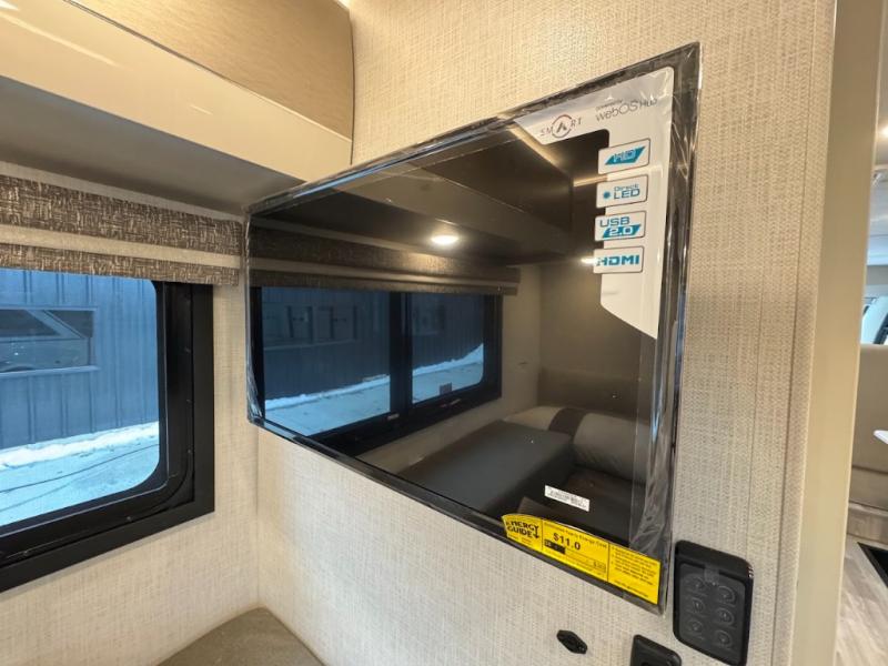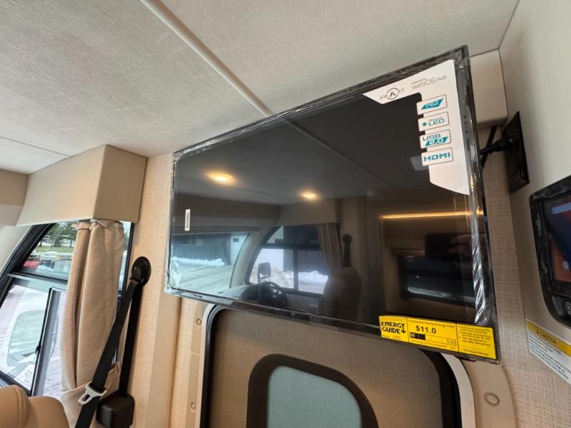 Plan to see it all in this Class A gas coach that can sleep four people each night. The sofa slide out includes a 32" Smart TV across from the sofa to watch your favorite shows. You will also find a 32" Smart TV in the rear bedroom, along with twin beds that convert to a king-size bed if you like. The spacious full bath includes a stainless steel sink, a shower skylight, and convenient robe hooks. Breakfast, lunch, and dinner can be made on the two burner gas cooktop or in the convection microwave with an air fryer, and the 12V double door refrigerator can store your perishables for the whole week.