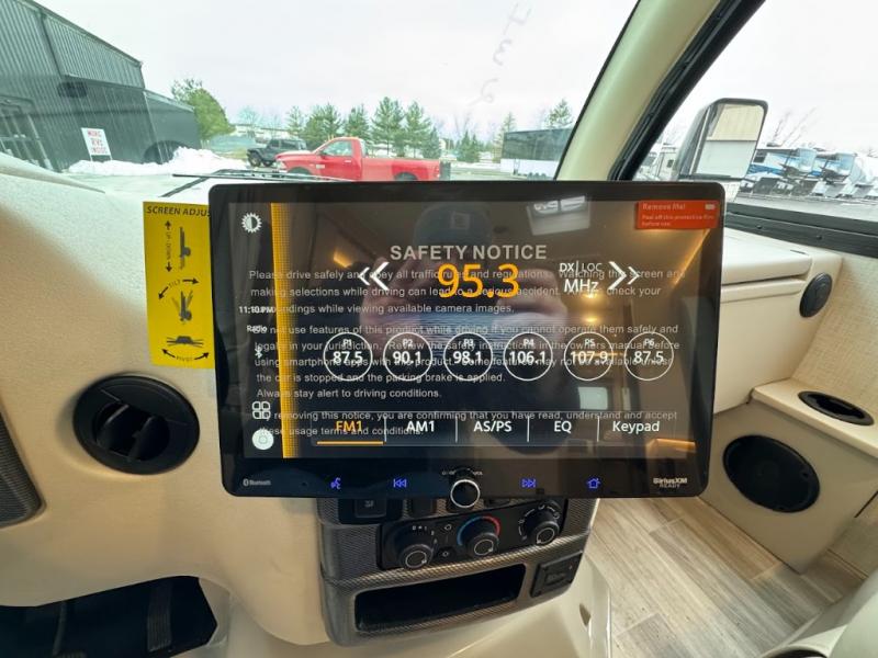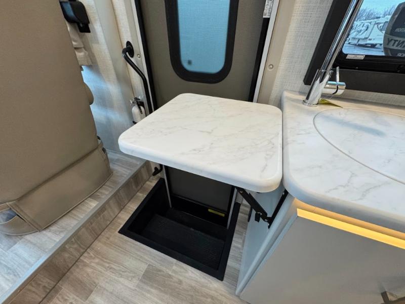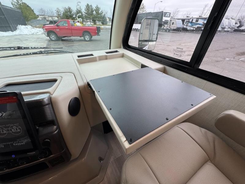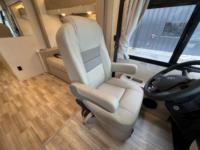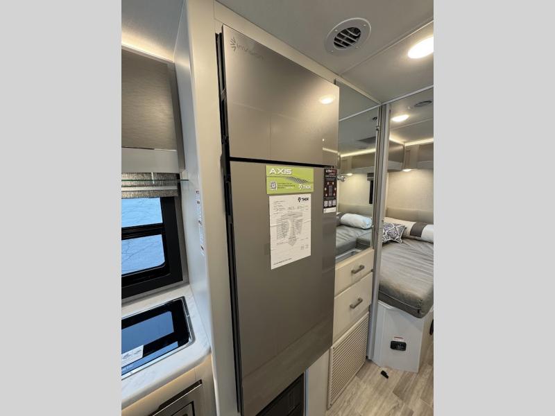 With any Axis Class A gas motorhome by Thor Motor Coach you will enjoy added technology features to make each trip enjoyable, like the RapidCamp+ multiplex lighting and systems control and the Winegard ConnecT 2.0 Wi-Fi/4G/TV antenna. Each model features heated and remote exterior mirrors with integrated side view cameras, reclining and swivel leatherette captain's chairs, and a dash workstation with 110-volt and 12-volt outlets to get some work done if needed. Relaxing after a long day of traveling will be easy with the leatherette furniture, complete kitchen and bath amenities, and 82" interior ceiling height. The HD-MAX exterior with graphics package and black frameless windows provide a sleek look you are sure to love, and don't overlook the lateral arm power awning with integrated LED lighting and lighted rotocast storage compartments for all your gear.