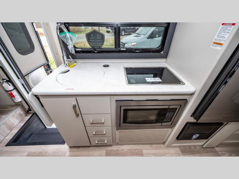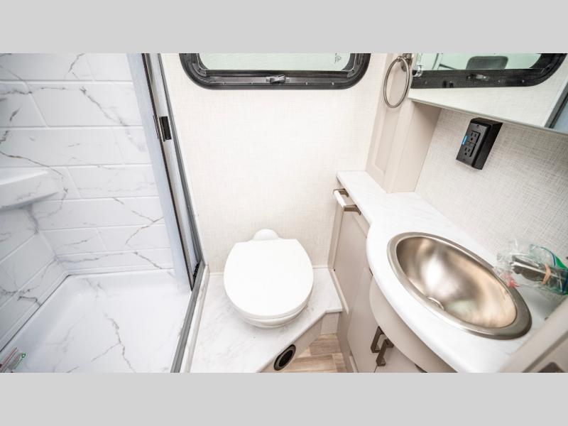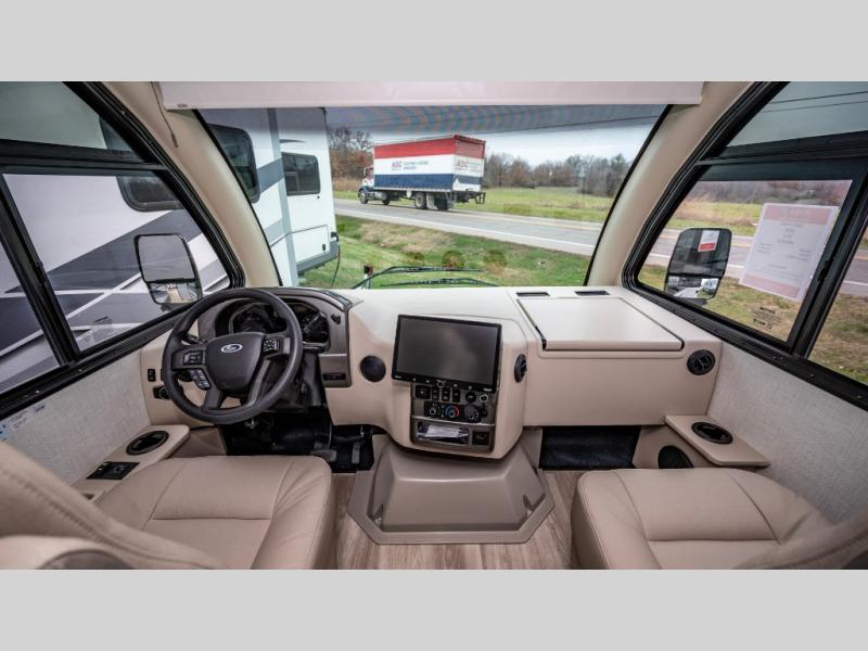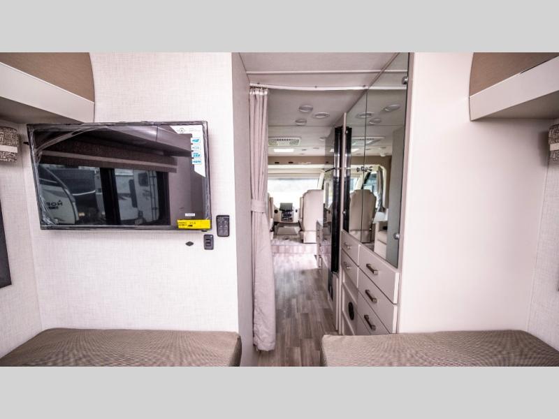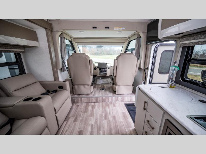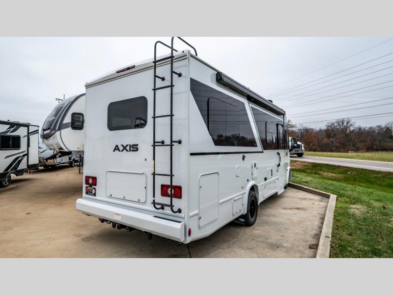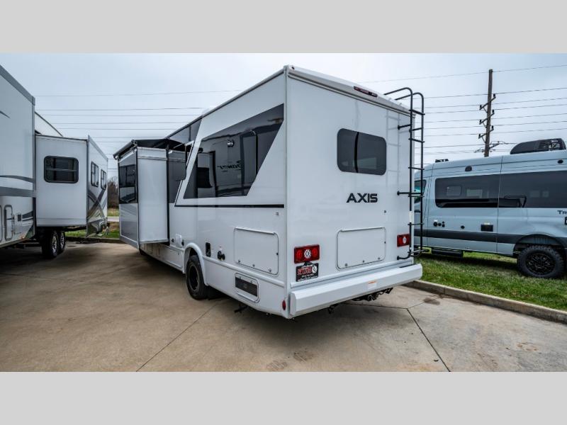 With any Axis Class A gas motorhome by Thor Motor Coach you will enjoy added technology features to make each trip enjoyable, like the RapidCamp+ multiplex lighting and systems control and the Winegard ConnecT 2.0 Wi-Fi/4G/TV antenna. Each model features heated and remote exterior mirrors with integrated side view cameras, reclining and swivel leatherette captain's chairs, and a dash workstation with 110-volt and 12-volt outlets to get some work done if needed. Relaxing after a long day of traveling will be easy with the leatherette furniture, complete kitchen and bath amenities, and 82" interior ceiling height. The HD-MAX exterior with graphics package and black frameless windows provide a sleek look you are sure to love, and don't overlook the lateral arm power awning with integrated LED lighting and lighted rotocast storage compartments for all your gear.