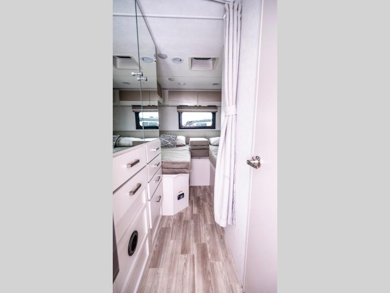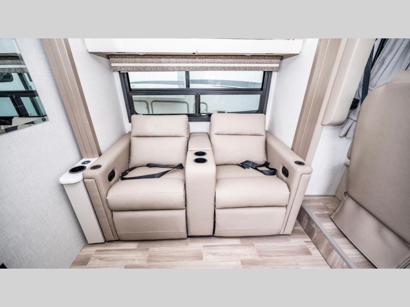 Wherever you decide to roam, you can be sure to make the most out of each trip in this coach! The swivel captain's seats can be turned to face the main living room once you park, and there is additional seating space on the theater seating. There is even a 32" Smart TV across from the sofa to enjoy movies! It will be so easy to make meals with a two burner gas cooktop and convection microwave with an air fryer, plus there is a 12V double door refrigerator for cold items. A full bath will let you freshen up after a day of exploring, and the rear bedroom with a privacy curtain is sure to bring comfort. Here, you'll enjoy twin beds with a king bed conversion, a USB power charging center for your electronics, and a 32" Smart TV so you can watch shows in bed!