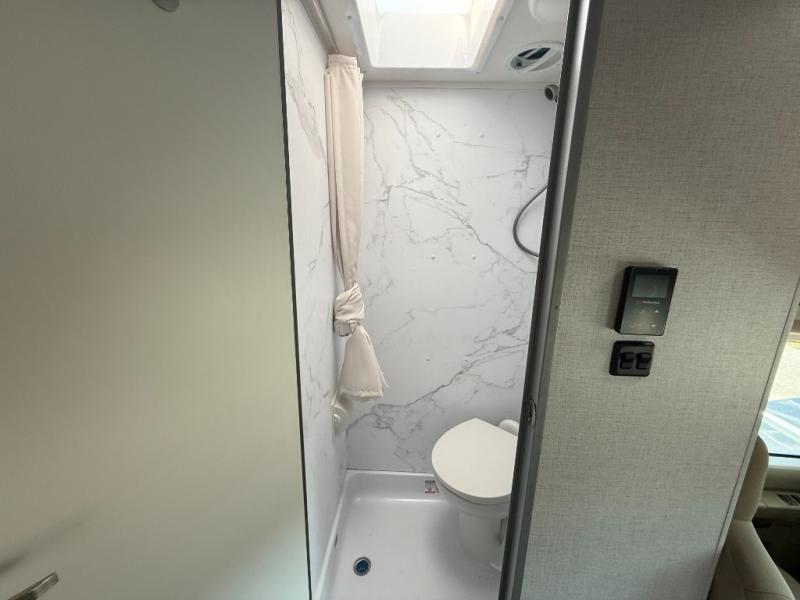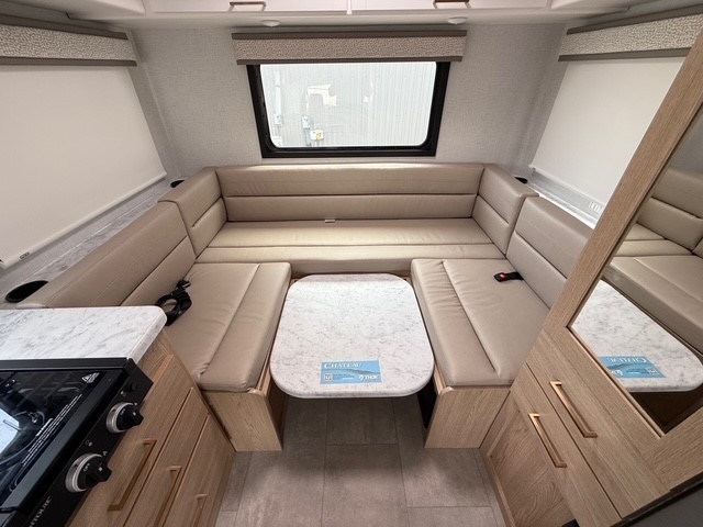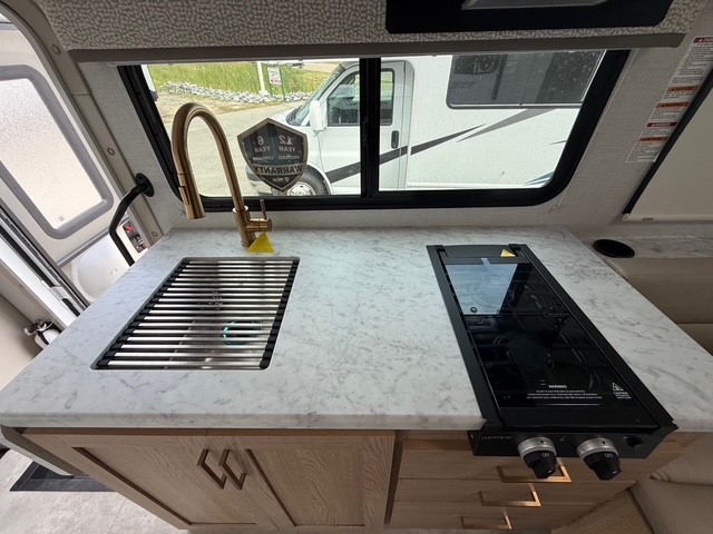 This compact, yet cozy coach is perfect for trips to the campground each weekend! Once you've reached your destination, you can set up the 11' power awning, unload the exterior storage compartments, and relax in your camp chairs. The two burner gas cooktop and convection microwave with an air fryer will let you make meals each day, and there is a 12V refrigerator to keep food fresh. A flip-up counter is another great feature that will give you more prep space! You can freshen up in the wet bath, grab your night clothes from the closet, then convert the U-shaped dinette into a 54" x 77" bed for a great night's rest!