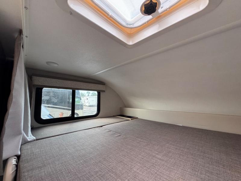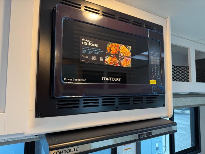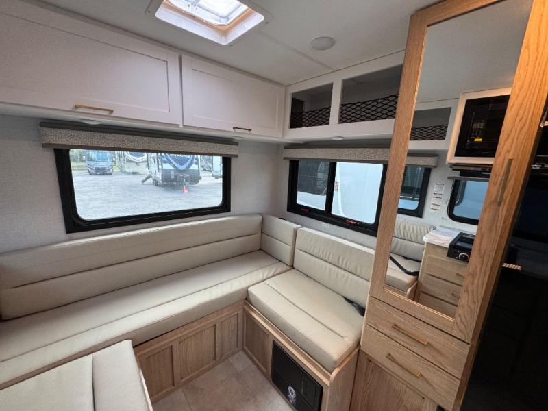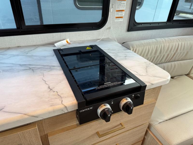 This compact, yet cozy coach is perfect for trips to the campground each weekend! Once you've reached your destination, you can set up the 11' power awning, unload the exterior storage compartments, and relax in your camp chairs. The two burner gas cooktop and convection microwave with an air fryer will let you make meals each day, and there is a 12V refrigerator to keep food fresh. A flip-up counter is another great feature that will give you more prep space! You can freshen up in the wet bath, grab your night clothes from the closet, then convert the U-shaped dinette into a 54" x 77" bed for a great night's rest!
