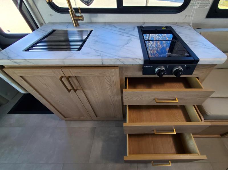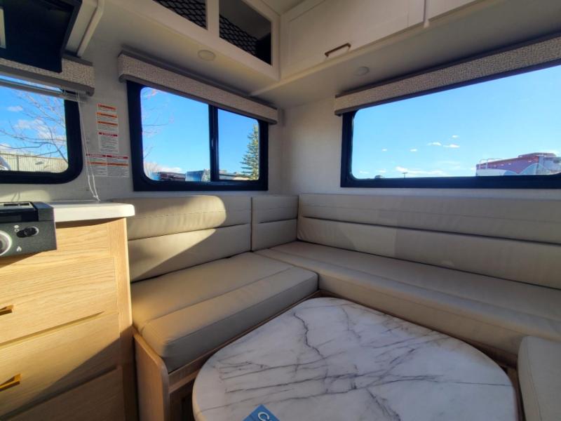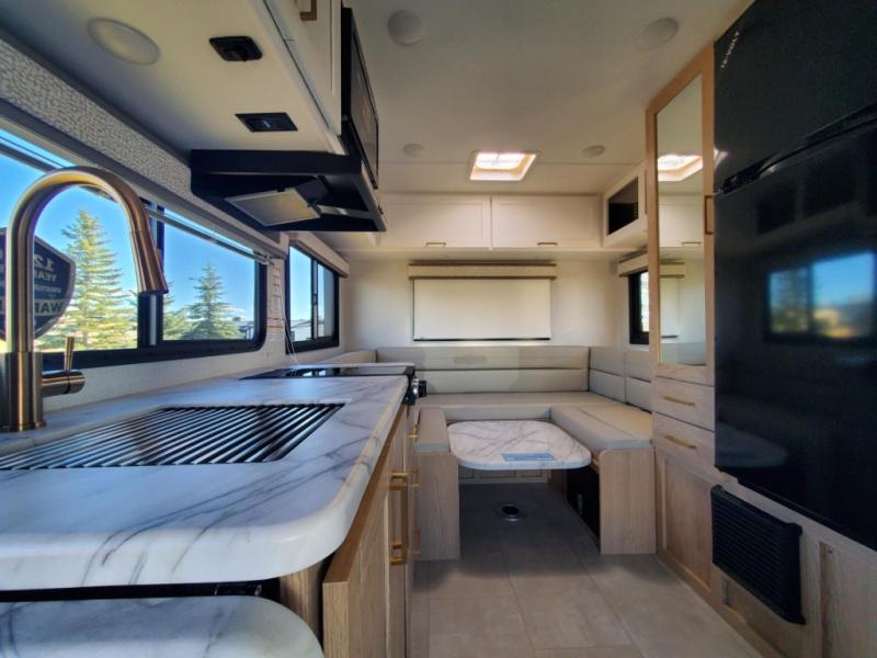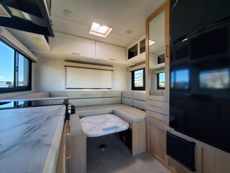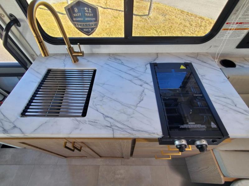 This compact, yet cozy coach is perfect for trips to the campground each weekend! Once you've reached your destination, you can set up the 11' power awning, unload the exterior storage compartments, and relax in your camp chairs. The two burner gas cooktop and convection microwave with an air fryer will let you make meals each day, and there is a 12V refrigerator to keep food fresh. A flip-up counter is another great feature that will give you more prep space! You can freshen up in the wet bath, grab your night clothes from the closet, then convert the U-shaped dinette into a 54" x 77" bed for a great night's rest!