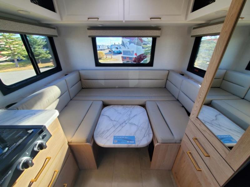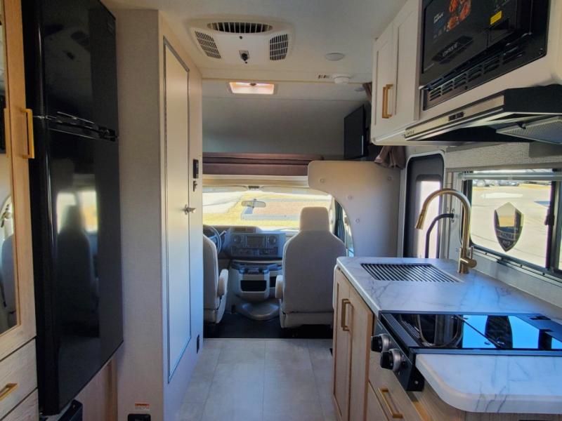 With any Chateau ESpec Class C gas motorhome by Thor Motor Coach, you will find convenient amenities, a modern interior, and a reliable Ford E-Series chassis, with an optional Chevy chassis on select models to power your adventures. There is welded tubular aluminum roof and sidewall cage construction, a one-piece fiberglass front cap, and a premium one-piece domed roof membrane for added strength. Residential vinyl flooring will be easy to keep clean, and you'll love the sleek look of the Hampton Collection two-toned cabinets. These motorhomes also include a 50 State 4.0 kW dual gas/LP generator and a 30-amp shoreline power cord to keep you going, along with a tankless water heater and 13,500 roof front A/C to ensure your comfort!