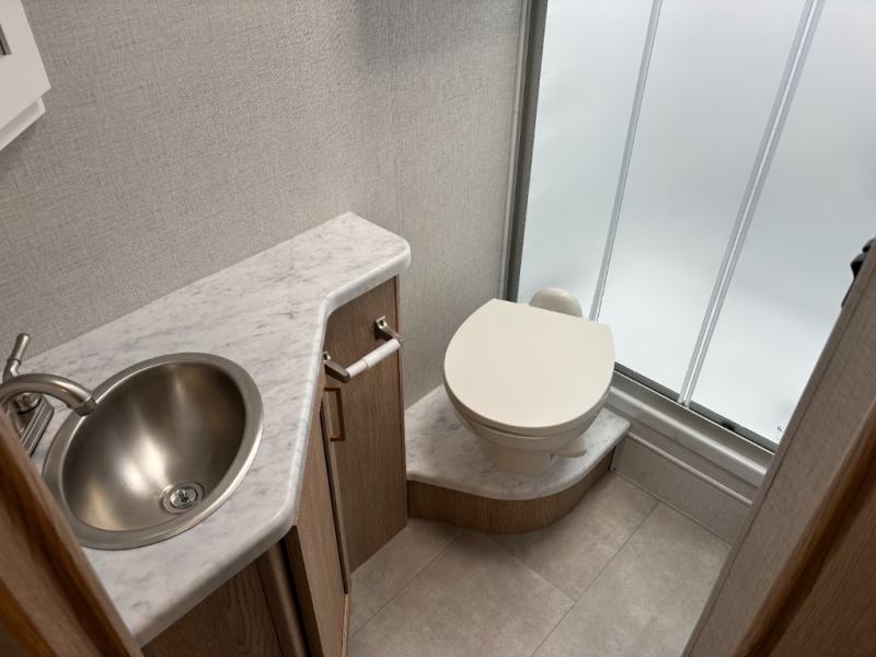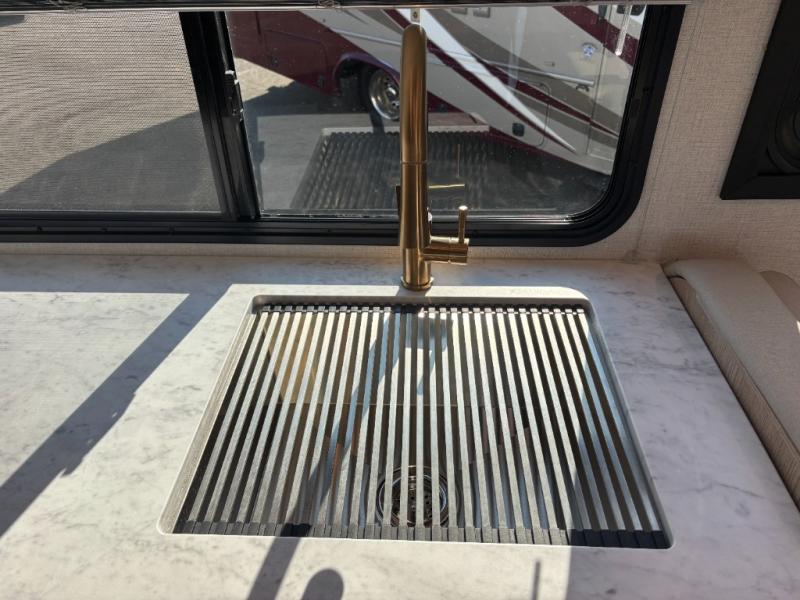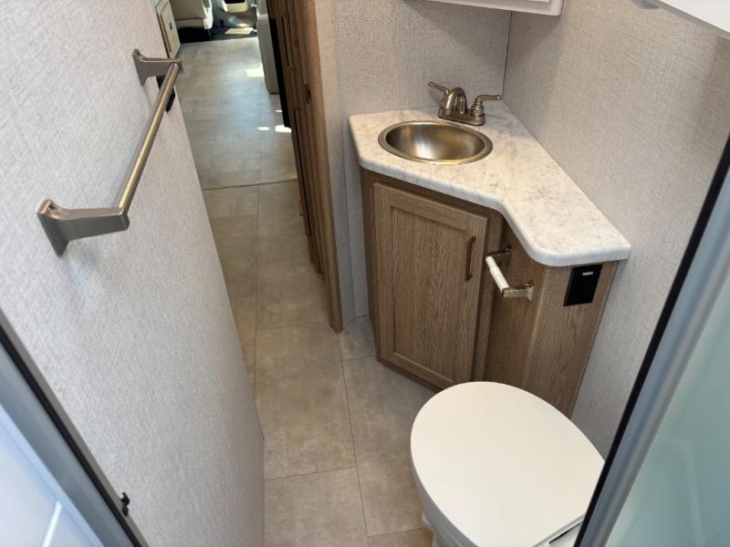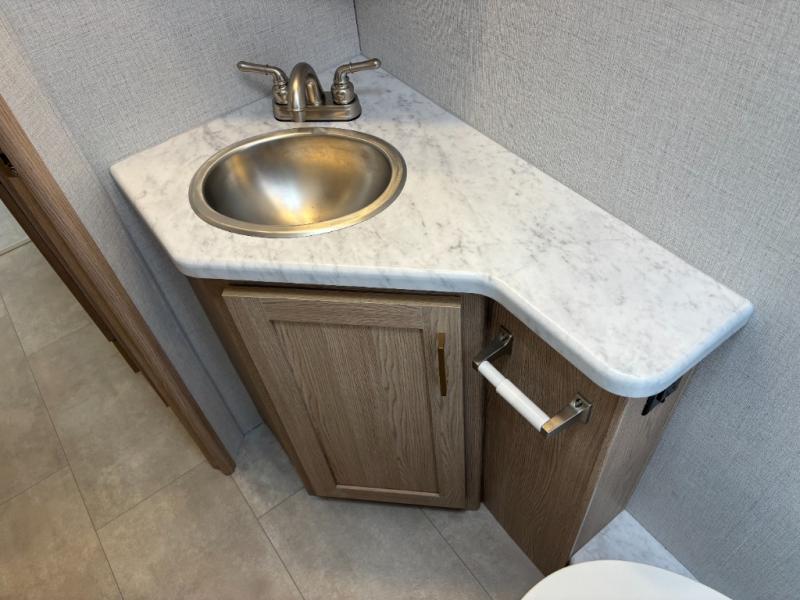 You will feel right at home traveling in this motorhome! After a long day being on the road, you can freshen up in the rear corner bathroom with the 30" x 36" shower that has a skylight above for more head space and natural lighting, plus robe hooks for added convenience. There is a linen closet to store your items, a pantry for snacks, and a refrigerator for your perishables. The 71" Dream Dinette is not only great for enjoying meals and playing card games, but also for transforming into an extra sleeping space. Speaking of sleeping, you also have a 72" x 74" king bed slide to lay your head on and a 52" x 96" bunk over cab!