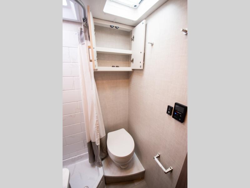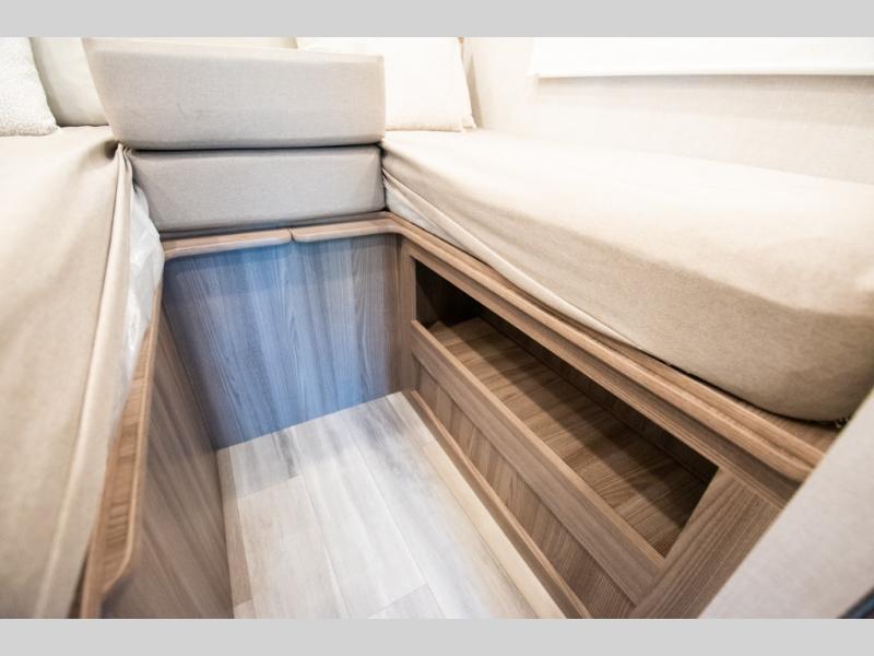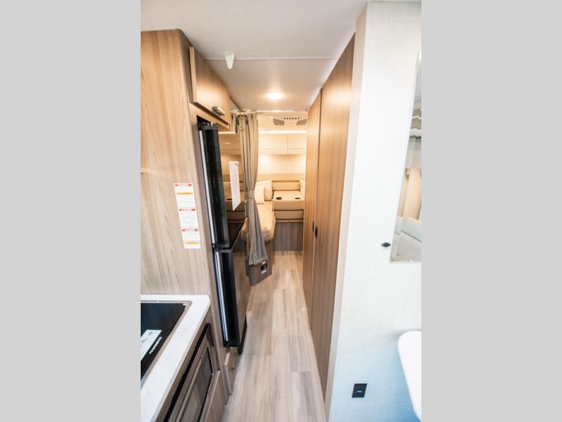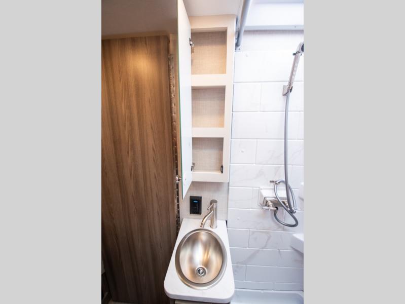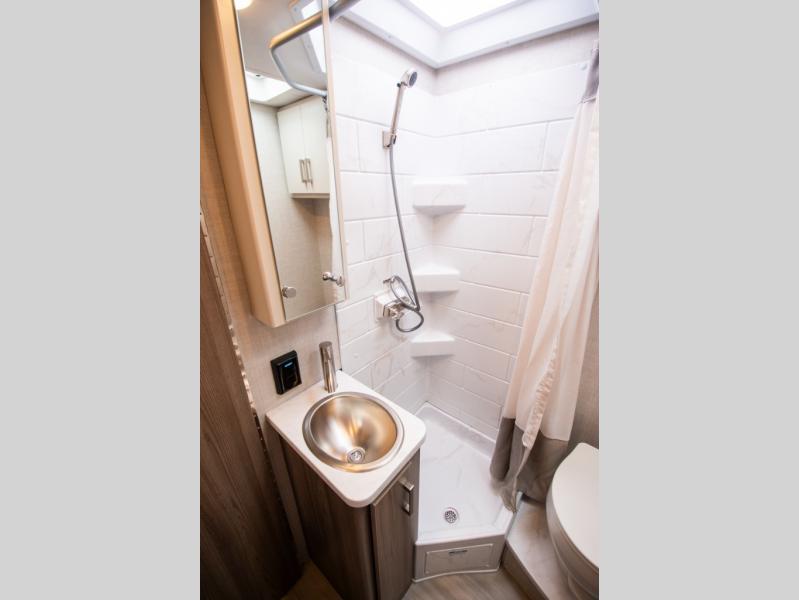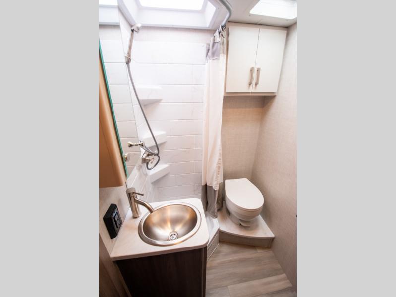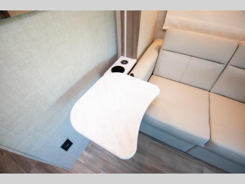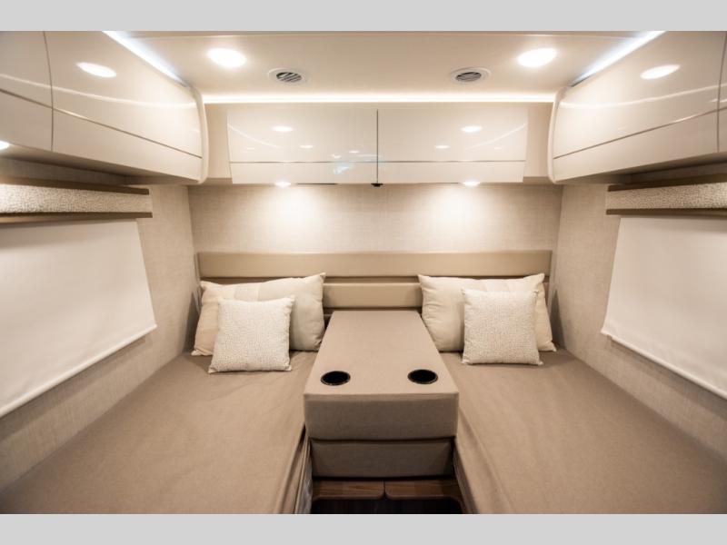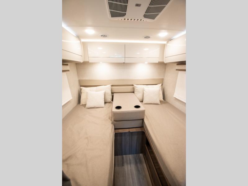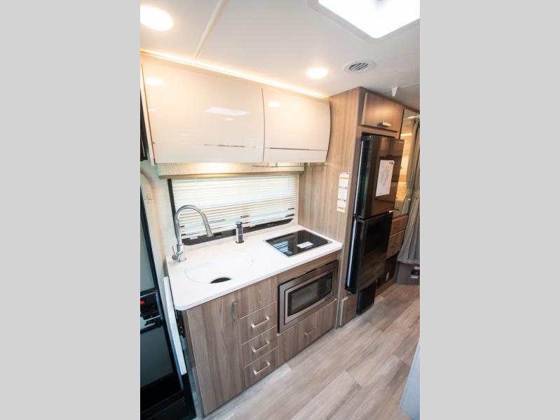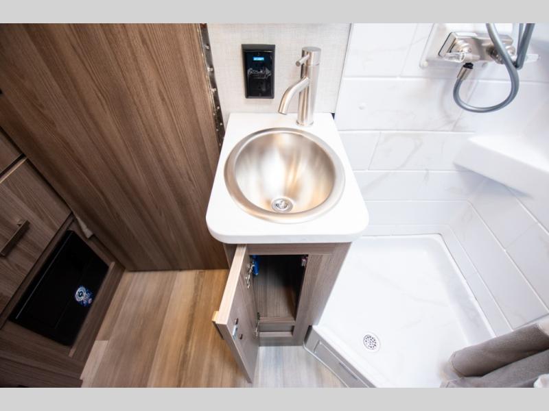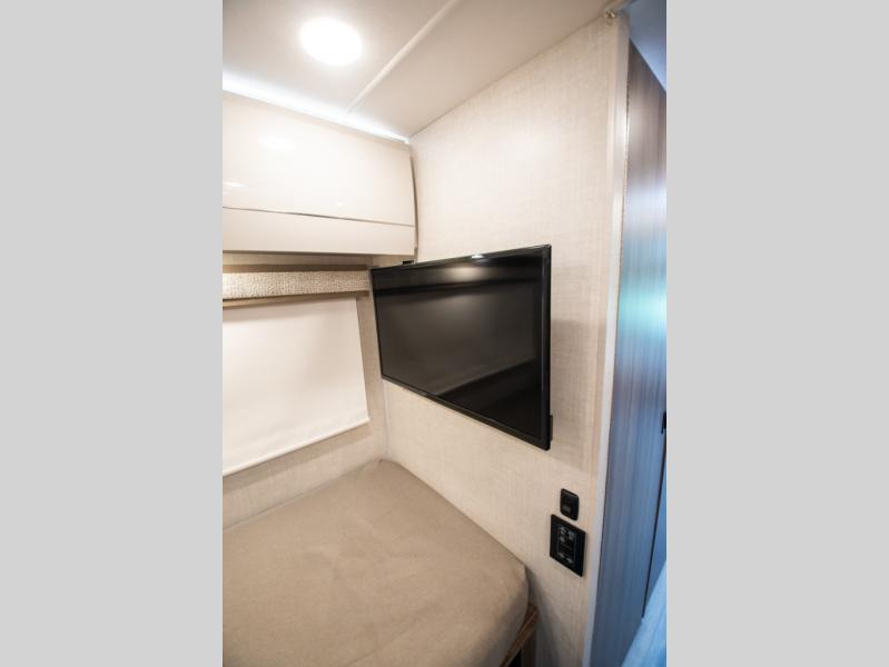 The perfect coach for two whether you are a couple or not! This Compass AWD model features a set of twin beds that can easily convert to a king bed if you like. Enjoy the added space thanks to a slide out jack-knife sofa. You will appreciate the kitchen amenities for light meals and snacks while on the road, plus the onboard bath offers a 27" x 27" radius shower, toilet, and sink which is convenient as well. There are also two 32" Smart TVs in this coach, one over the side entry opposite the seating in front, and one back in the sleeping area at the foot of the roadside twin bed. A built-in skylight offers the ability to stargaze in the front of the coach on a clear night.