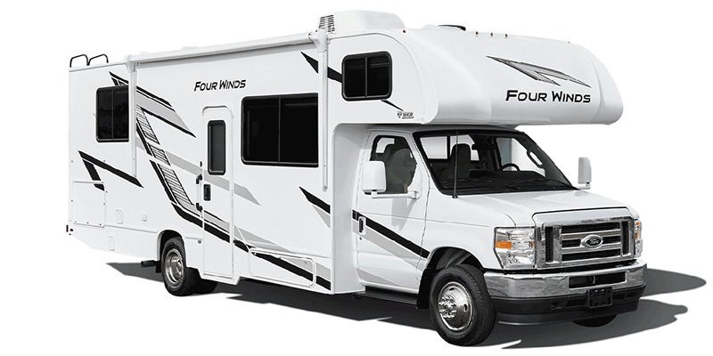 With any Four Winds ESpec Class C gas motorhome by Thor Motor Coach, you will find convenient amenities, a modern interior, and a reliable Ford E-Series chassis, with an optional Chevy chassis on select models to power your adventures. There is welded tubular aluminum roof and sidewall cage construction, a one-piece fiberglass front cap, and a one-piece domed roof membrane for added strength. Residential vinyl flooring will be easy to keep clean, and you'll love the sleek look of the Hampton Collection, two-toned cabinets. These motorhomes also include a 50 state 4.0 kW dual gas/LP generator and a 30-amp shoreline power cord to keep you going, along with a tankless water heater and 13,500 roof front A/C to ensure your comfort!