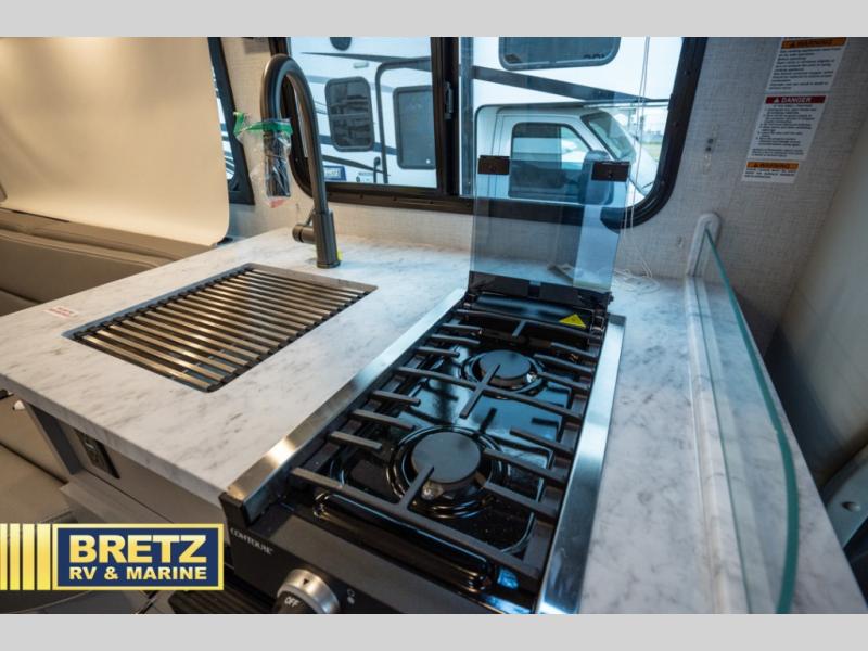 This compact coach will be perfect for your trips across the state or country! Once you park for the day, you can make dinner on the two-burner gas cooktop or in the convection microwave. There is a 12V refrigerator plus an additional quick access pull-out refrigerator to keep drinks stocked! The two twin-size benches/beds can convert to a king-size bed, and there are removable tables here where you can easily dine and play card games at. The rear wet bath includes a power bath vent, a foot flush toilet, and a skylight, plus there is a closet nearby for easy access to clean clothes!