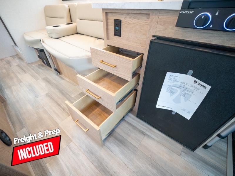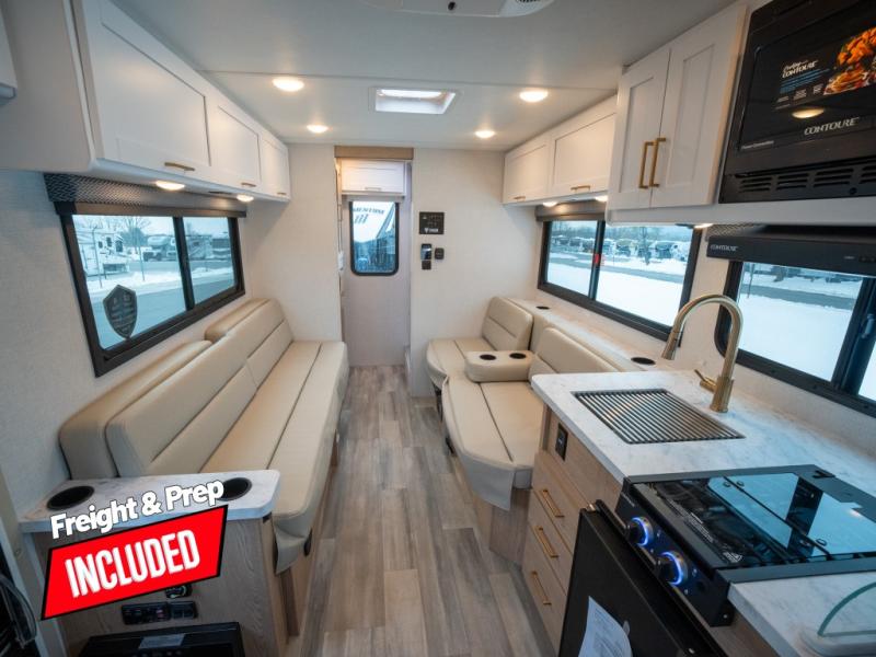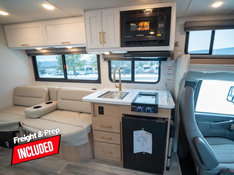 With any Four Winds ESpec Class C gas motorhome by Thor Motor Coach, you will find convenient amenities, a modern interior, and a reliable chassis. There is welded tubular aluminum roof and sidewall cage construction, a one-piece fiberglass front cap, and a one-piece domed roof membrane for added strength. Residential vinyl flooring will be easy to keep clean, and you'll love the sleek look of the Hampton Collection, two-toned cabinets. These motorhomes also include a 50 state 4.0 kW dual gas/LP generator and a 30-amp shoreline power cord to keep you going, along with a tankless water heater and 13,500 roof front A/C to ensure your comfort!