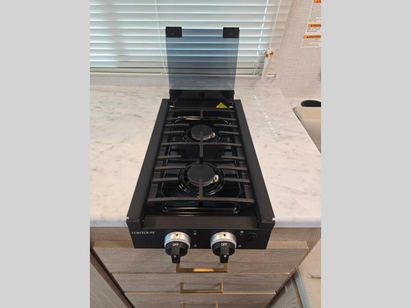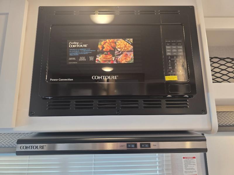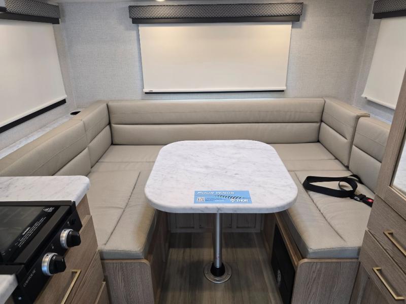 This compact, yet cozy coach is perfect for trips to the campground each weekend! Once you've reached your destination, you can set up the 11' power awning, unload the exterior storage compartments, and relax in your camp chairs. The two burner gas cooktop and convection microwave with an air fryer will let you make meals each day, and there is a 12V refrigerator to keep food fresh. A flip-up counter is another great feature that will give you more prep space! You can freshen up in the wet bath, grab your night clothes from the closet, then convert the U-shaped dinette into a 54" x 77" bed for a great night's rest!