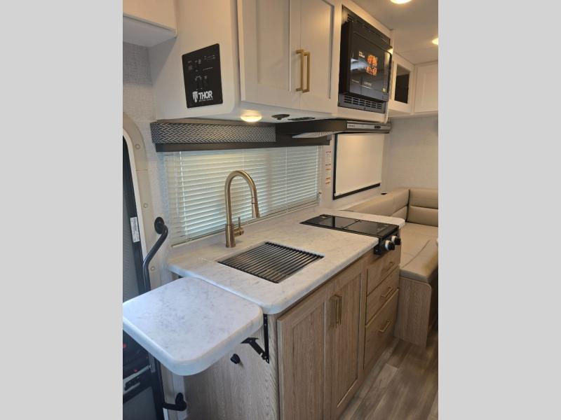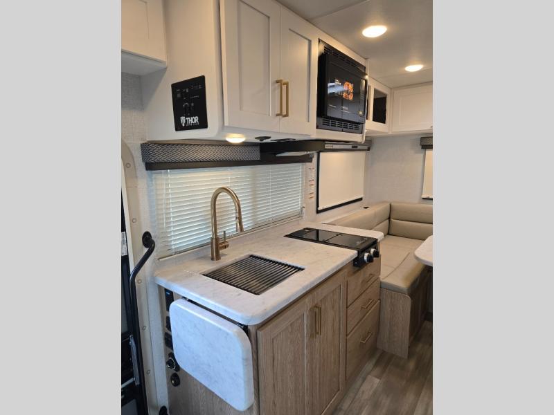 With any Four Winds ESpec Class C gas motorhome by Thor Motor Coach, you will find convenient amenities, a modern interior, and a reliable Ford E-Series chassis, with an optional Chevy chassis on select models to power your adventures. There is welded tubular aluminum roof and sidewall cage construction, a one-piece fiberglass front cap, and a one-piece domed roof membrane for added strength. Residential vinyl flooring will be easy to keep clean, and you'll love the sleek look of the Hampton Collection, two-toned cabinets. These motorhomes also include a 50 state 4.0 kW dual gas/LP generator and a 30-amp shoreline power cord to keep you going, along with a tankless water heater and 13,500 roof front A/C to ensure your comfort!