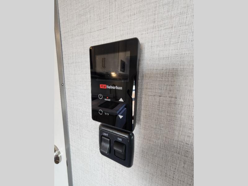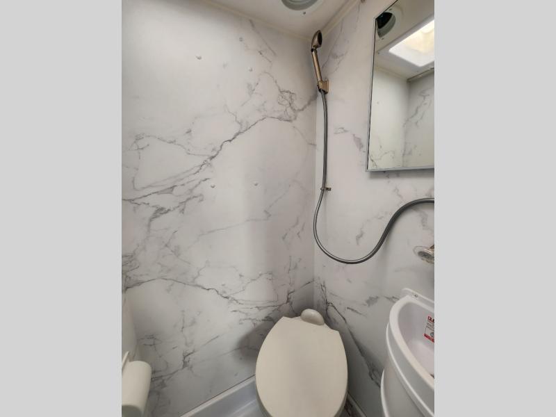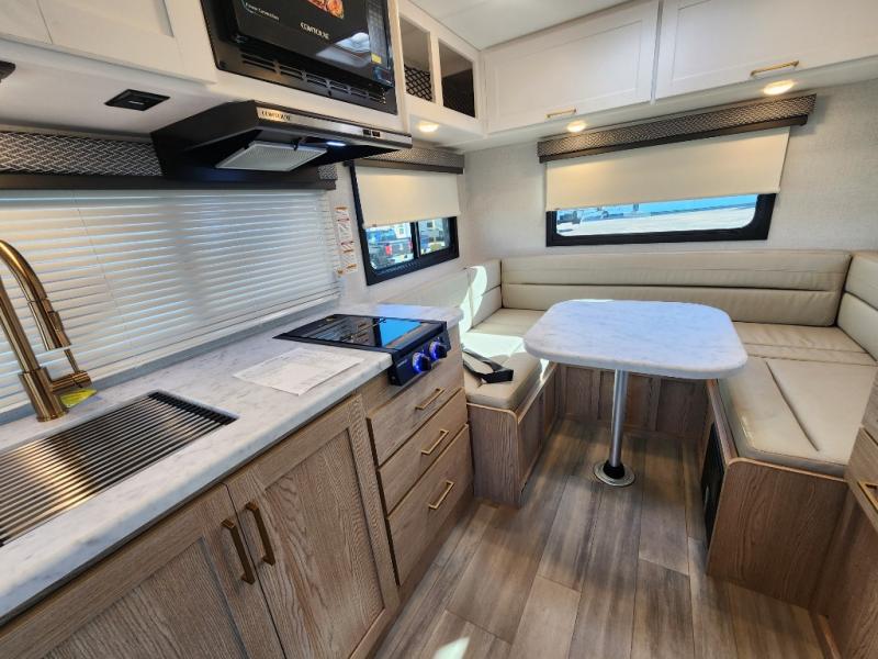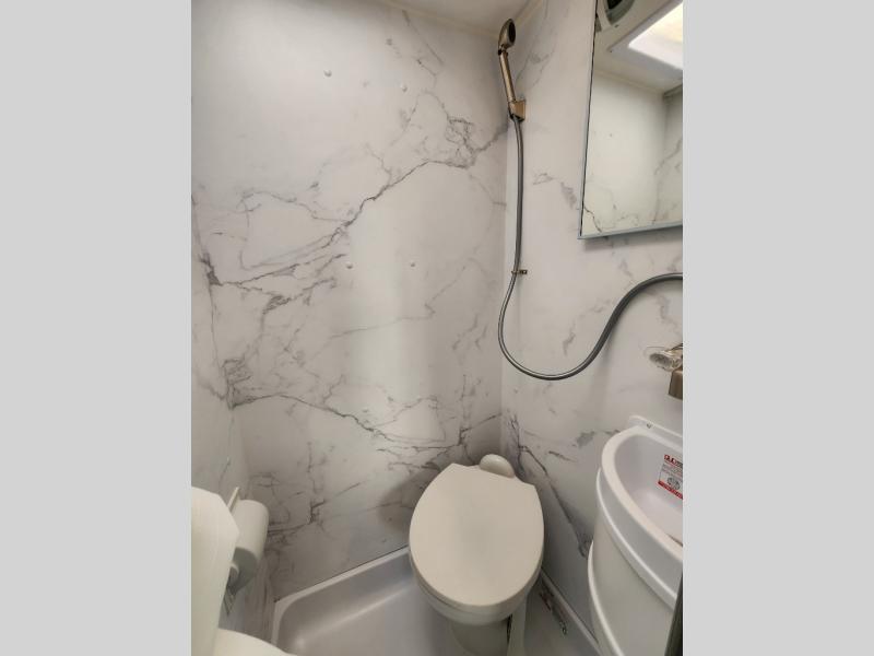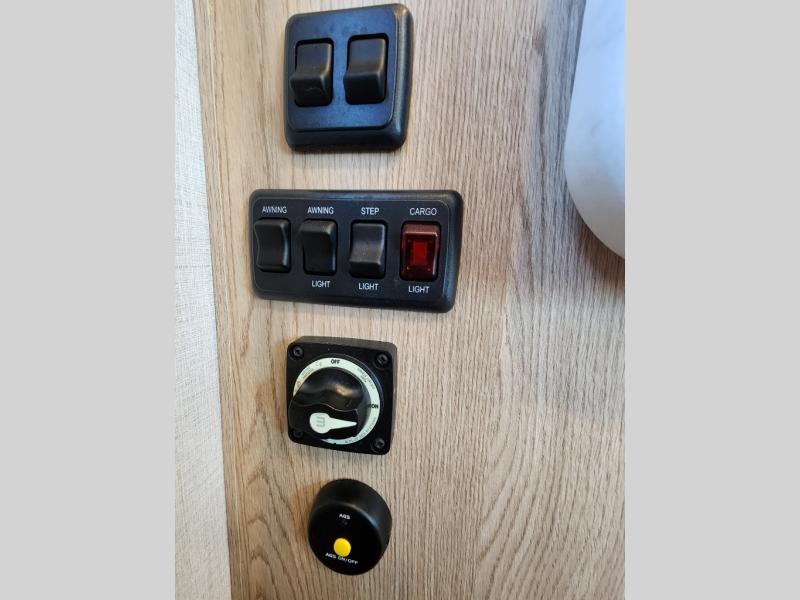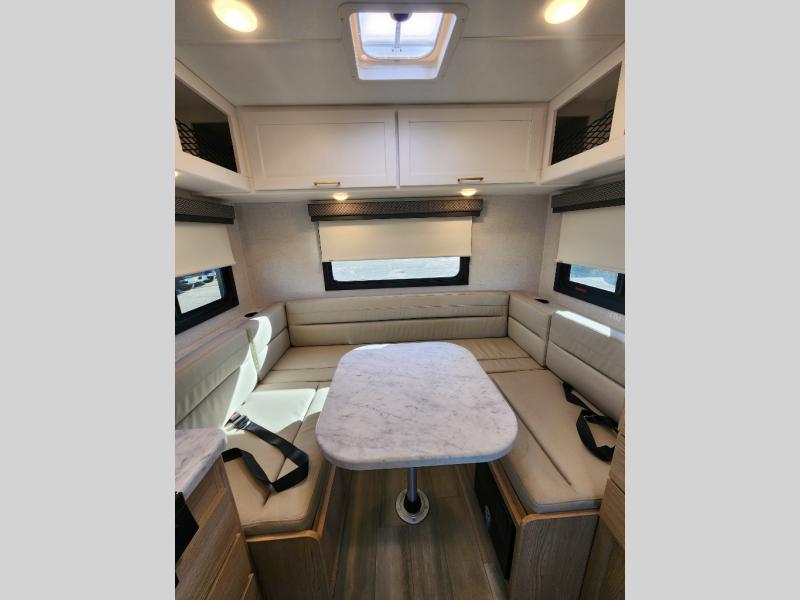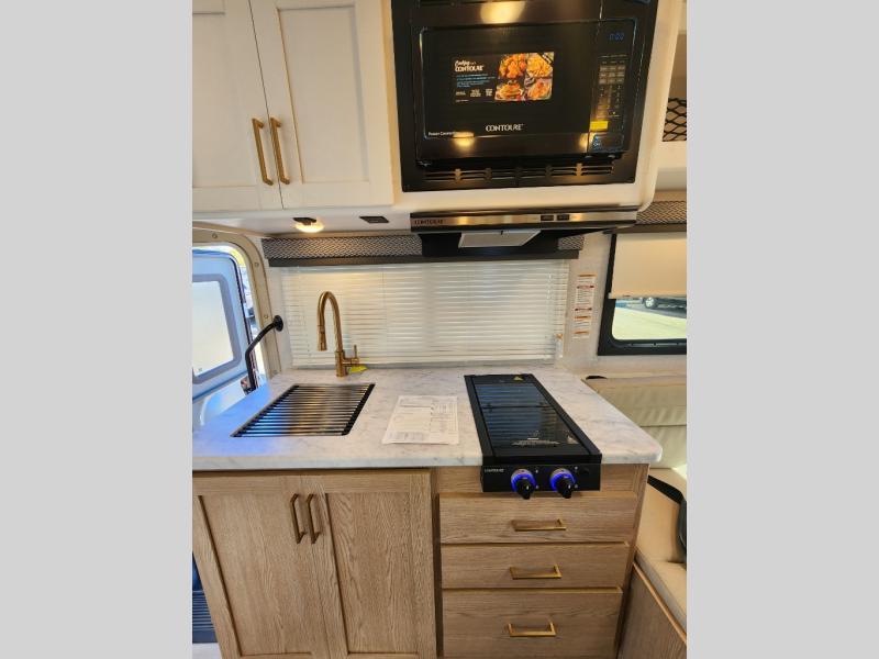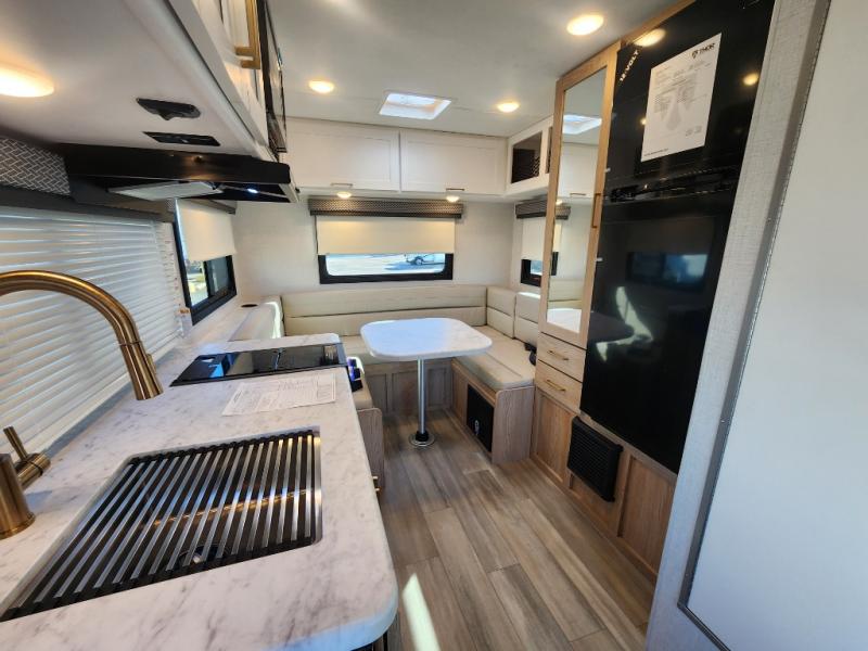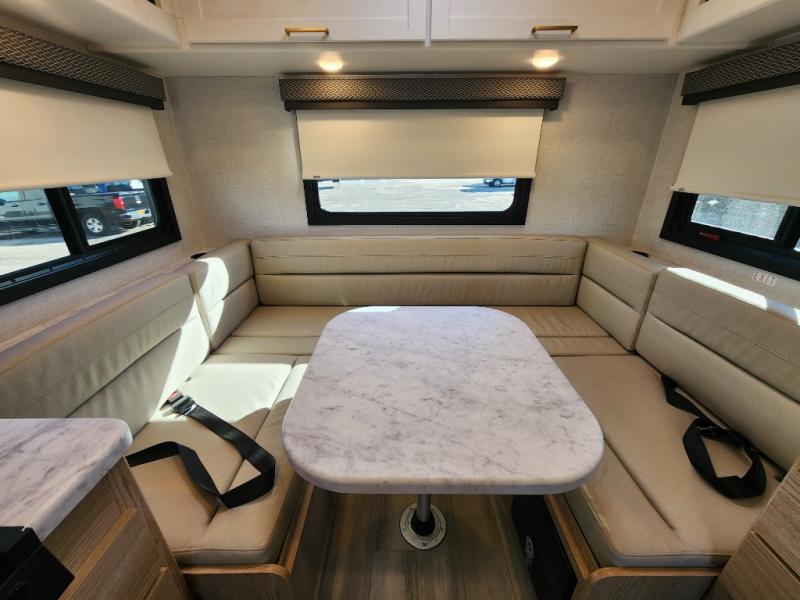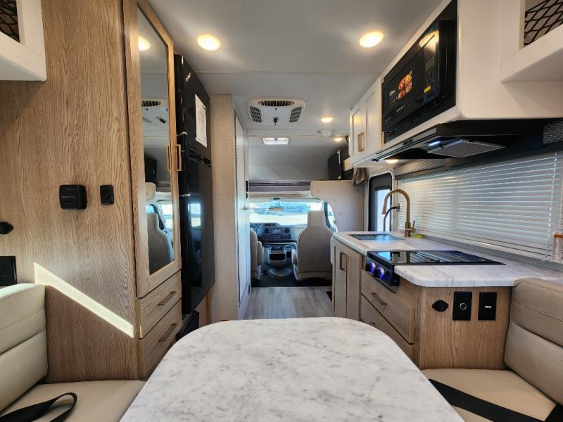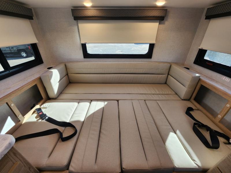This compact, yet cozy coach is perfect for trips to the campground each weekend! Once you've reached your destination, you can set up the 11' power awning, unload the exterior storage compartments, and relax in your camp chairs. The two burner gas cooktop and convection microwave with an air fryer will let you make meals each day, and there is a 12V refrigerator to keep food fresh. A flip-up counter is another great feature that will give you more prep space! You can freshen up in the wet bath, grab your night clothes from the closet, then convert the U-shaped dinette into a 54" x 77" bed for a great night's rest!