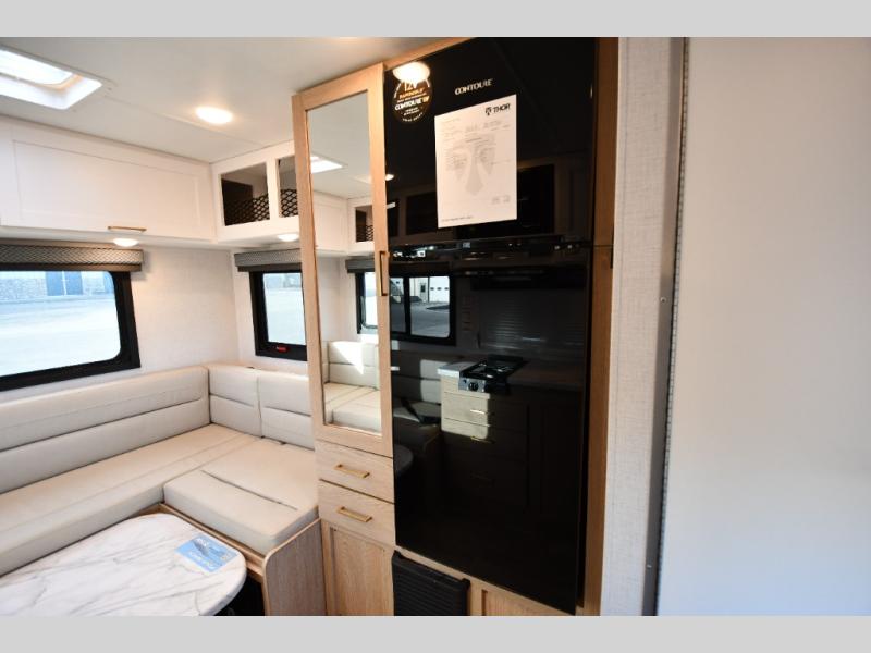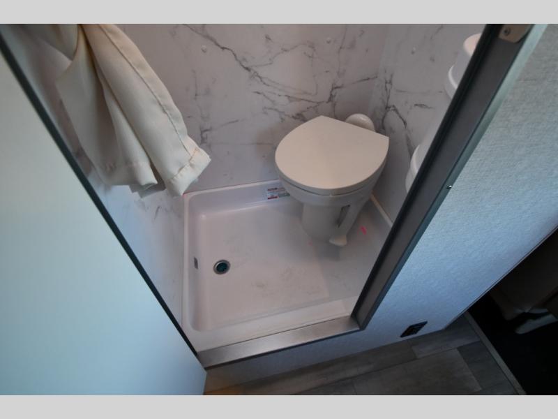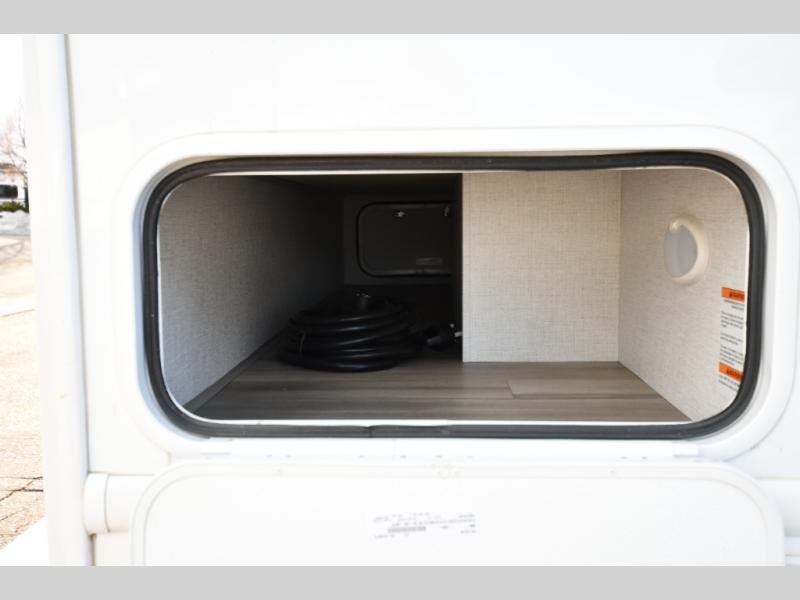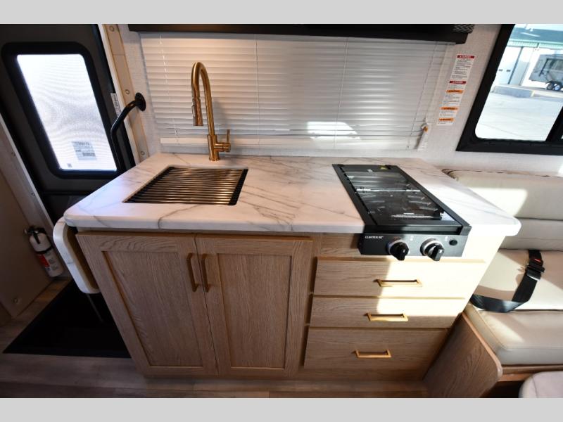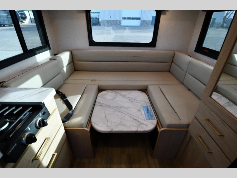 This compact, yet cozy coach is perfect for trips to the campground each weekend! Once you've reached your destination, you can set up the 11' power awning, unload the exterior storage compartments, and relax in your camp chairs. The two burner gas cooktop and convection microwave with an air fryer will let you make meals each day, and there is a 12V refrigerator to keep food fresh. A flip-up counter is another great feature that will give you more prep space! You can freshen up in the wet bath, grab your night clothes from the closet, then convert the U-shaped dinette into a 54" x 77" bed for a great night's rest!