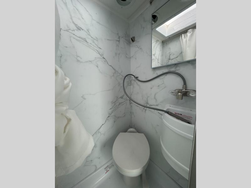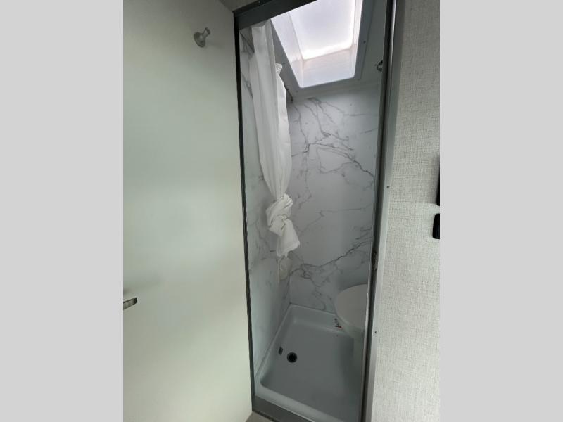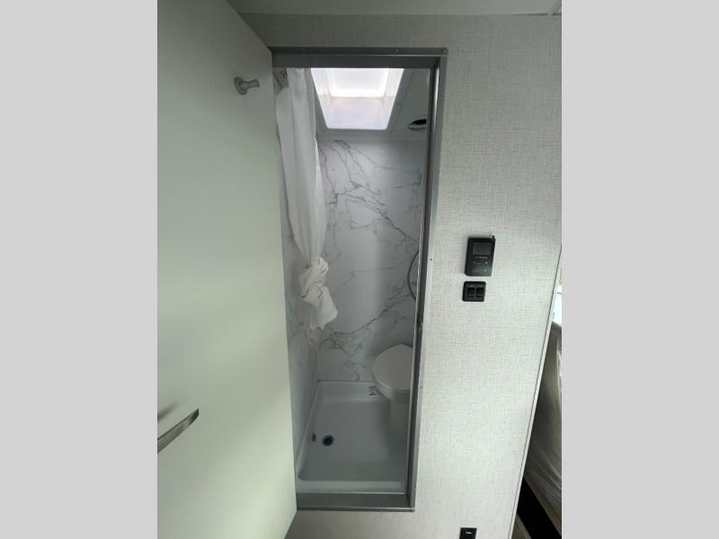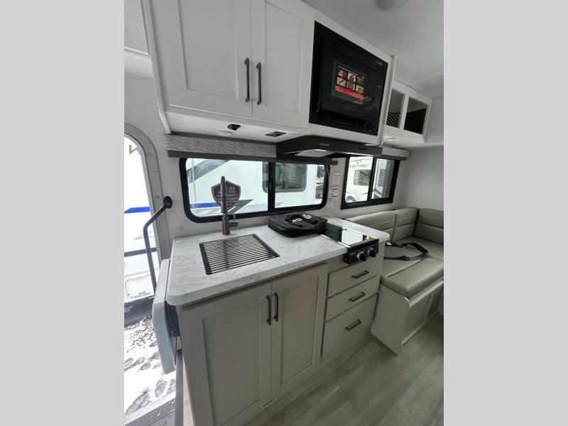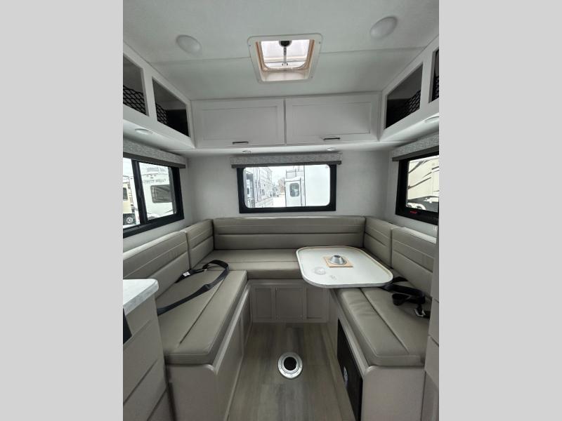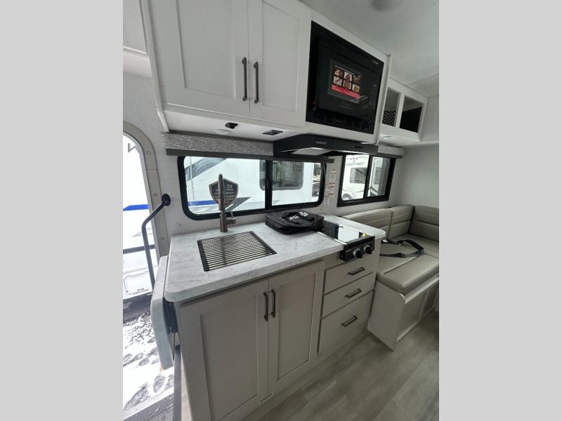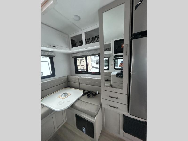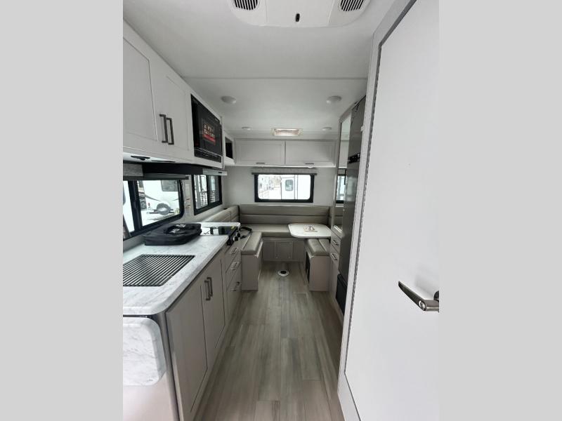 This compact, yet cozy coach is perfect for trips to the campground each weekend! Once you've reached your destination, you can set up the 11' power awning, unload the exterior storage compartments, and relax in your camp chairs. The two burner gas cooktop and convection microwave with an air fryer will let you make meals each day, and there is a 12V refrigerator to keep food fresh. A flip-up counter is another great feature that will give you more prep space! You can freshen up in the wet bath, grab your night clothes from the closet, then convert the U-shaped dinette into a 54" x 77" bed for a great night's rest!