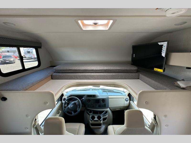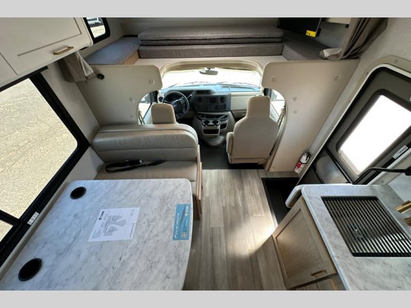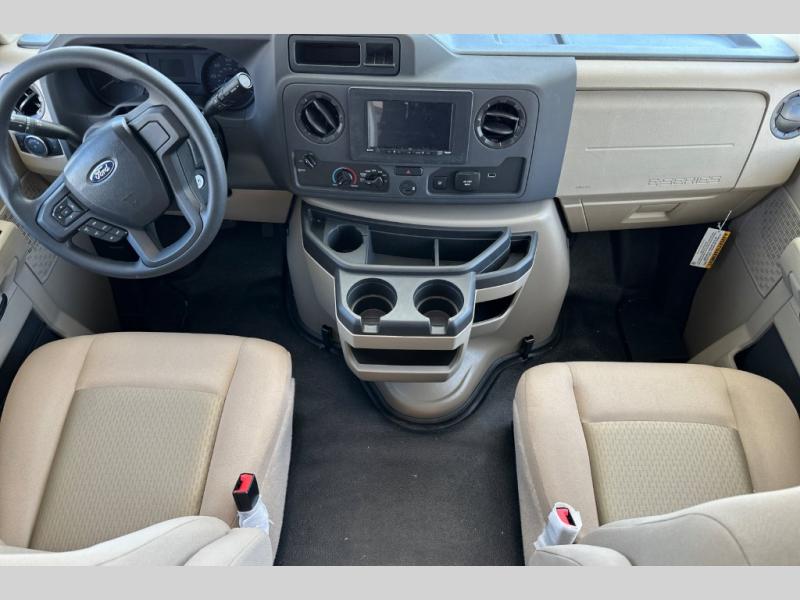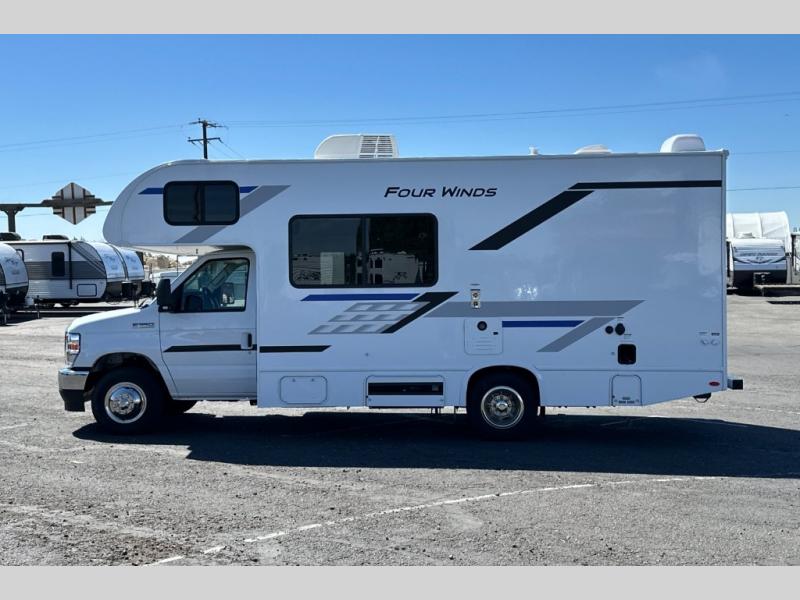 With any Four Winds ESpec Class C gas motorhome by Thor Motor Coach, you will find convenient amenities, a modern interior, and a reliable Ford E-Series chassis, with an optional Chevy chassis on select models to power your adventures. There is welded tubular aluminum roof and sidewall cage construction, a one-piece fiberglass front cap, and a one-piece domed roof membrane for added strength. Residential vinyl flooring will be easy to keep clean, and you'll love the sleek look of the Hampton Collection, two-toned cabinets. These motorhomes also include a 50 state 4.0 kW dual gas/LP generator and a 30-amp shoreline power cord to keep you going, along with a tankless water heater and 13,500 roof front A/C to ensure your comfort!