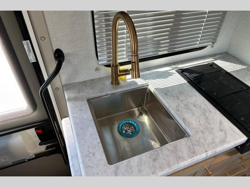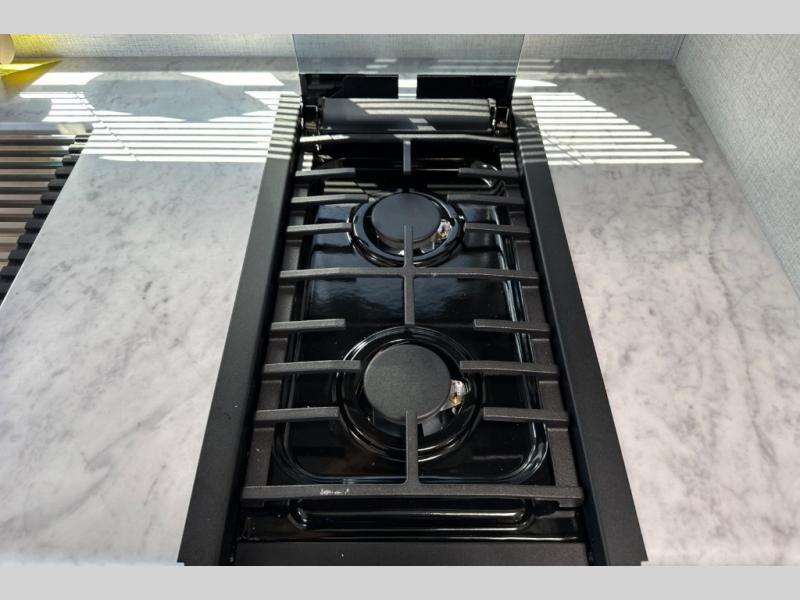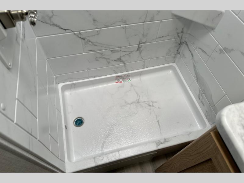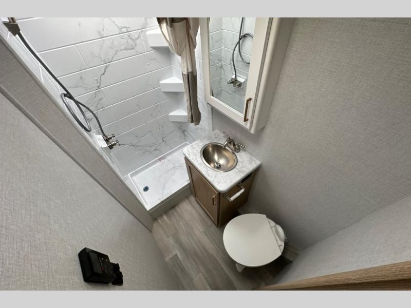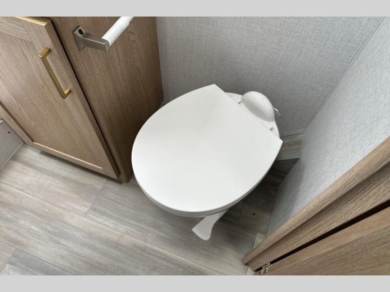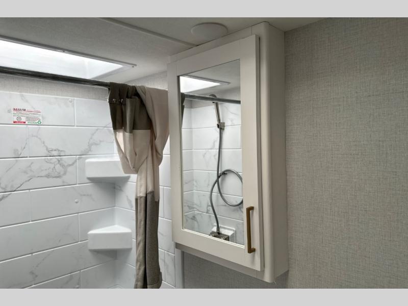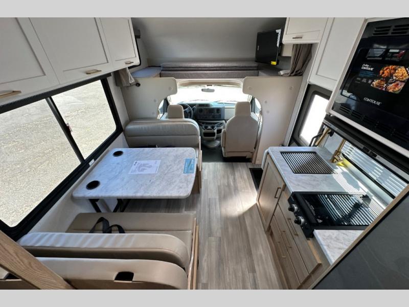 It won't be hard to find comfort in this coach for five! You can freshen up in the rear corner full bath once you've set up camp, then make lunch on the two burner gas cooktop or convection microwave with an air fryer. There is also a 12V refrigerator for cold items and a flip-up countertop for more space. Whether you dine at the Dream Dinette or take your plate outdoors under the 15' power awning, you're sure to have a great time in this motorhome. The rear corner full-size bed will provide a comfy place to rest your head at night, while your guests take the dinette and cab-over bunk!