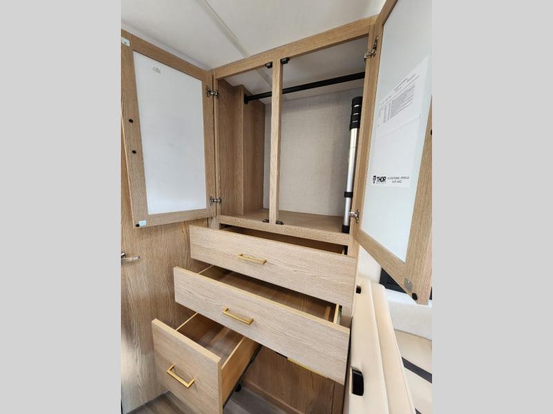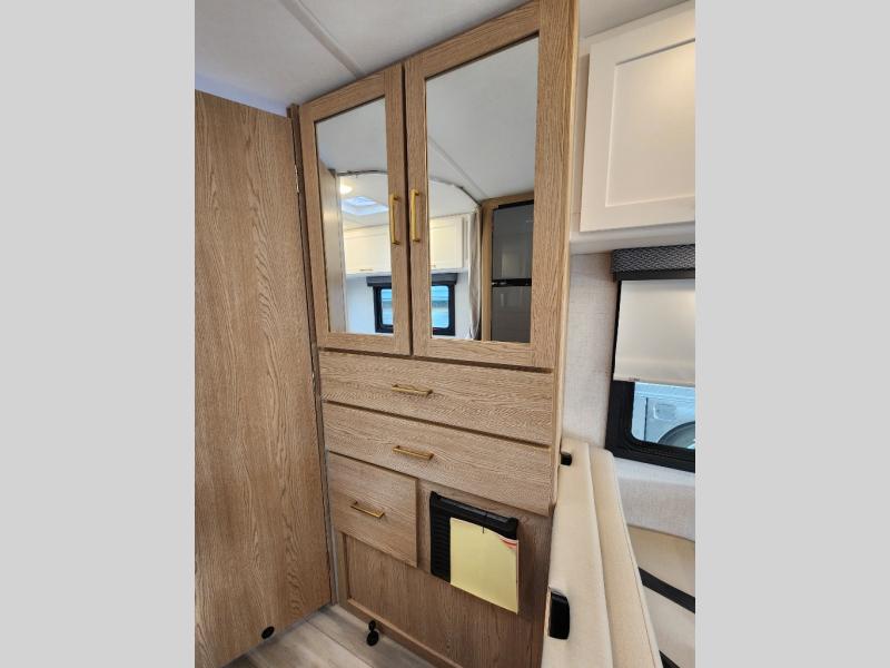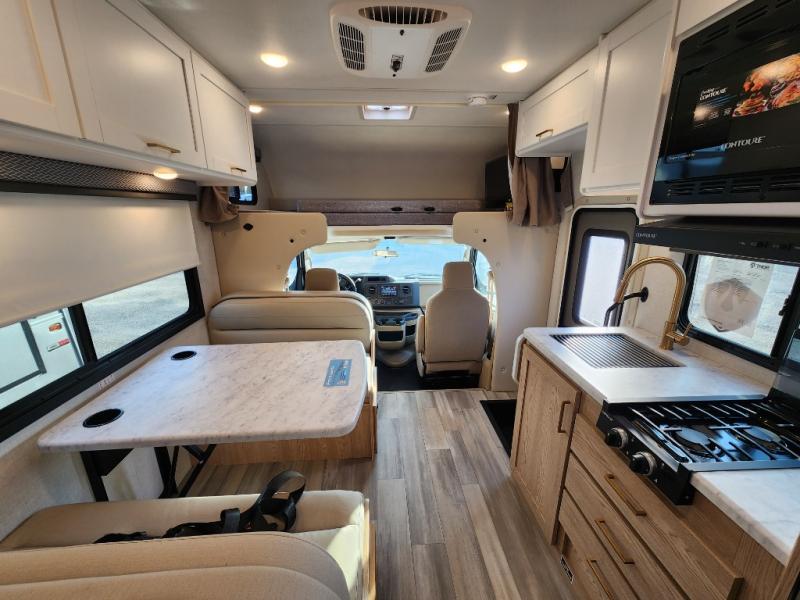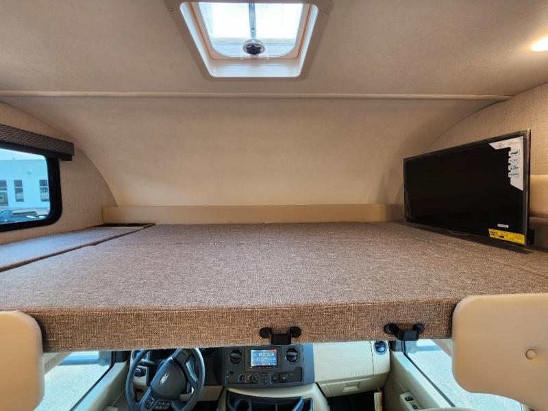 With any Four Winds ESpec Class C gas motorhome by Thor Motor Coach, you will find convenient amenities, a modern interior, and a reliable Ford E-Series chassis, with an optional Chevy chassis on select models to power your adventures. There is welded tubular aluminum roof and sidewall cage construction, a one-piece fiberglass front cap, and a one-piece domed roof membrane for added strength. Residential vinyl flooring will be easy to keep clean, and you'll love the sleek look of the Hampton Collection, two-toned cabinets. These motorhomes also include a 50 state 4.0 kW dual gas/LP generator and a 30-amp shoreline power cord to keep you going, along with a tankless water heater and 13,500 roof front A/C to ensure your comfort!