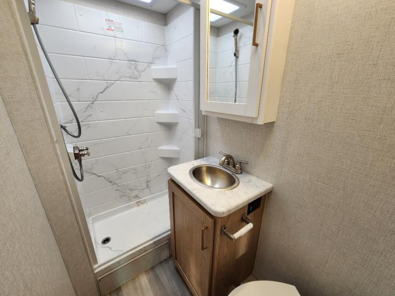 It won't be hard to find comfort in this coach for five! You can freshen up in the rear corner full bath once you've set up camp, then make lunch on the two burner gas cooktop or convection microwave with an air fryer. There is also a 12V refrigerator for cold items and a flip-up countertop for more space. Whether you dine at the Dream Dinette or take your plate outdoors under the 15' power awning, you're sure to have a great time in this motorhome. The rear corner full-size bed will provide a comfy place to rest your head at night, while your guests take the dinette and cab-over bunk!