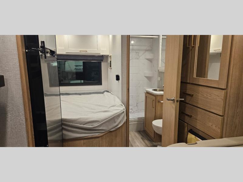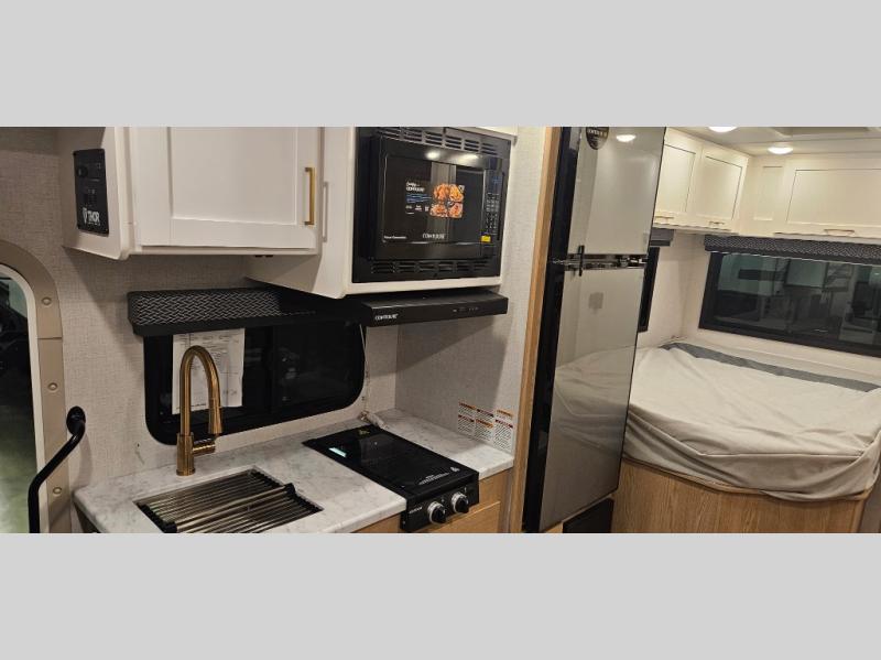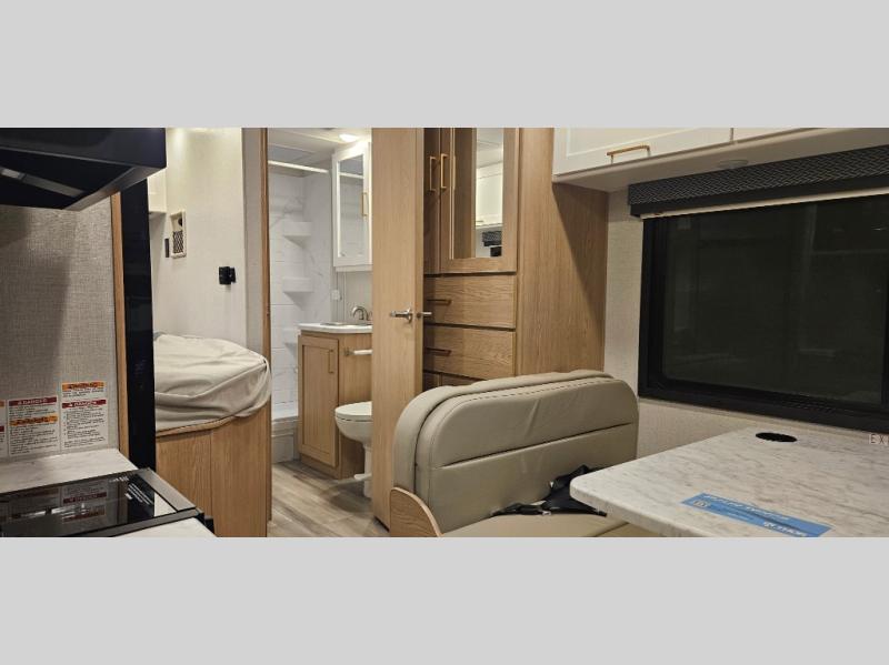 It won't be hard to find comfort in this coach for five! You can freshen up in the rear corner full bath once you've set up camp, then make lunch on the two burner gas cooktop or convection microwave with an air fryer. There is also a 12V refrigerator for cold items and a flip-up countertop for more space. Whether you dine at the Dream Dinette or take your plate outdoors under the 15' power awning, you're sure to have a great time in this motorhome. The rear corner full-size bed will provide a comfy place to rest your head at night, while your guests take the dinette and cab-over bunk!