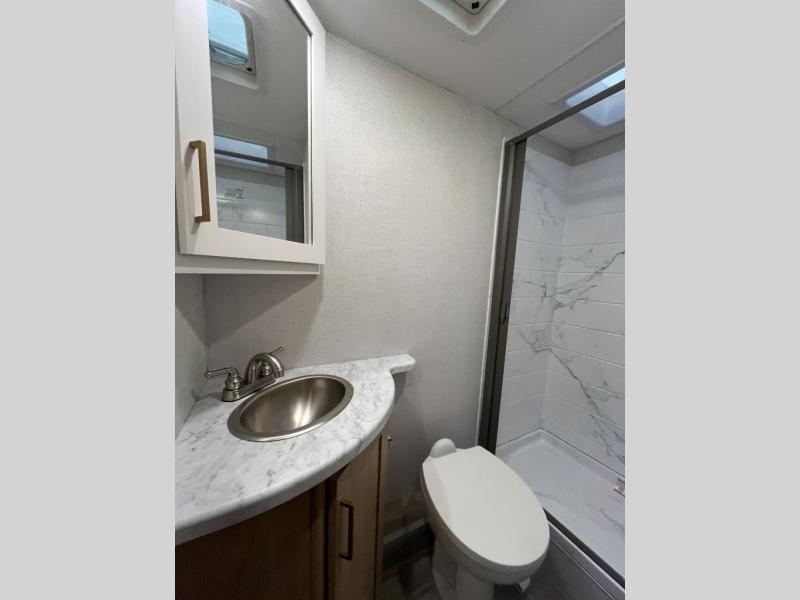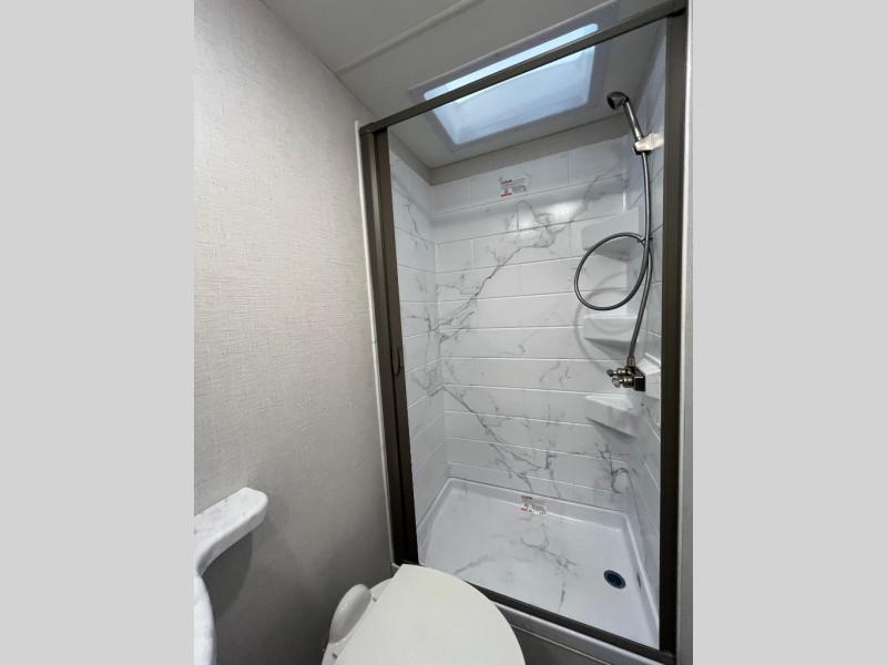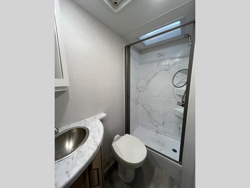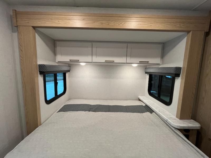 It won't be hard to find comfort in this coach for five! You can freshen up in the rear corner full bath once you've set up camp, then make lunch on the two burner gas cooktop or convection microwave with an air fryer. There is also a 12V refrigerator for cold items and a flip-up countertop for more space. Whether you dine at the Dream Dinette or take your plate outdoors under the 15' power awning, you're sure to have a great time in this motorhome. There is a semi-private bedroom with a 60" x 74" RV queen bed slide and bedroom TV prep if you want the option to watch movies in bed. And your guests can take the Dream Dinette and cab-over bunk at night!