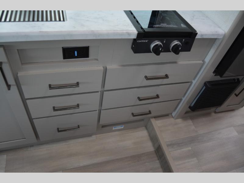 It won't be hard to find comfort in this coach for five! You can freshen up in the rear corner full bath once you've set up camp, then make lunch on the two burner gas cooktop or convection microwave with an air fryer. There is also a 12V refrigerator for cold items and a flip-up countertop for more space. Whether you dine at the Dream Dinette or take your plate outdoors under the 15' power awning, you're sure to have a great time in this motorhome. There is a semi-private bedroom with a 60" x 74" RV queen bed slide and bedroom TV prep if you want the option to watch movies in bed. And your guests can take the Dream Dinette and cab-over bunk at night!