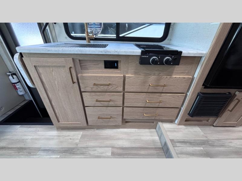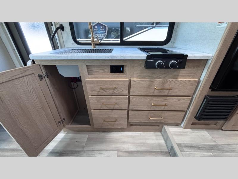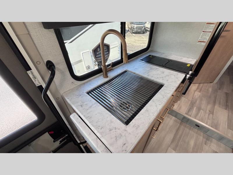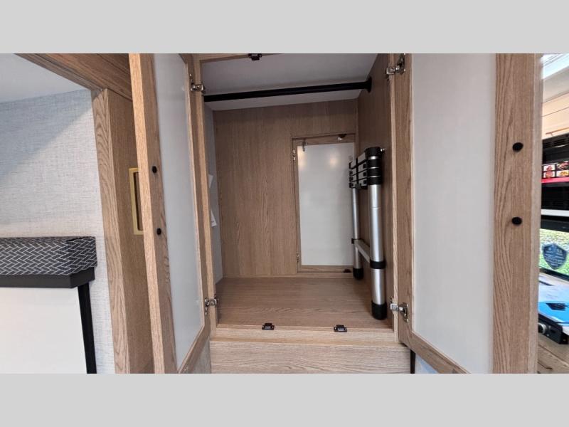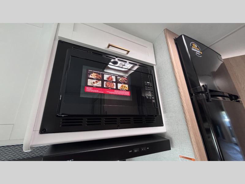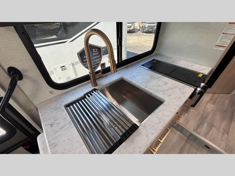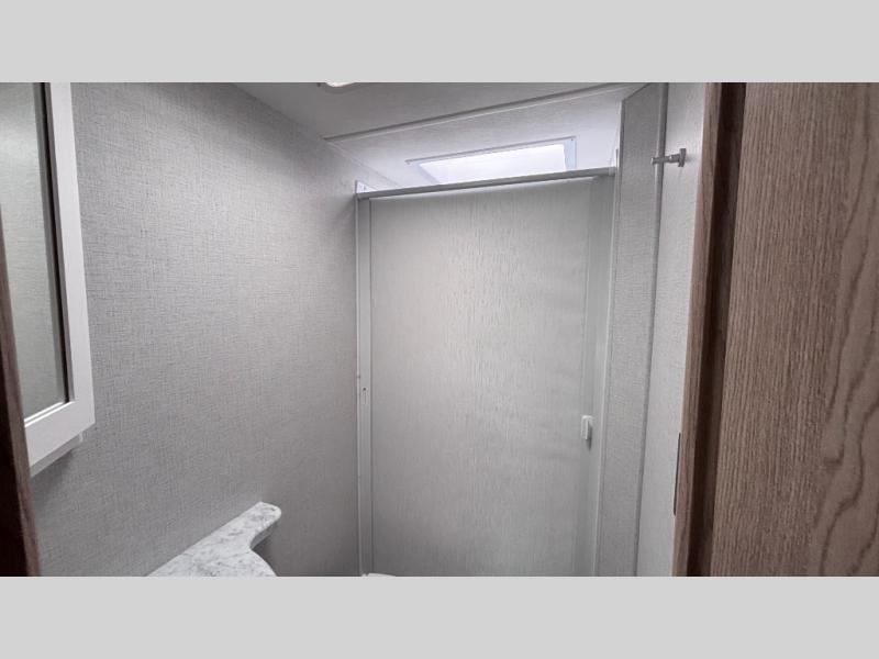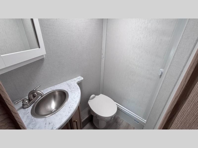 It won't be hard to find comfort in this coach for five! You can freshen up in the rear corner full bath once you've set up camp, then make lunch on the two burner gas cooktop or convection microwave with an air fryer. There is also a 12V refrigerator for cold items and a flip-up countertop for more space. Whether you dine at the Dream Dinette or take your plate outdoors under the 15' power awning, you're sure to have a great time in this motorhome. There is a semi-private bedroom with a 60" x 74" RV queen bed slide and bedroom TV prep if you want the option to watch movies in bed. And your guests can take the Dream Dinette and cab-over bunk at night!