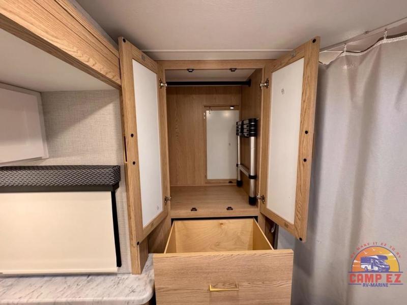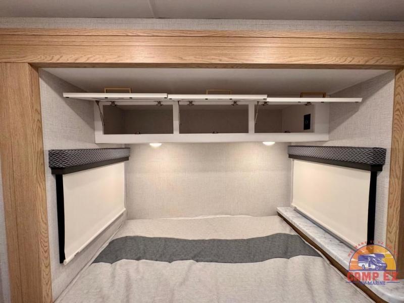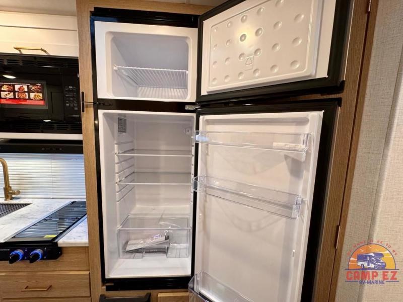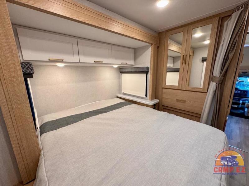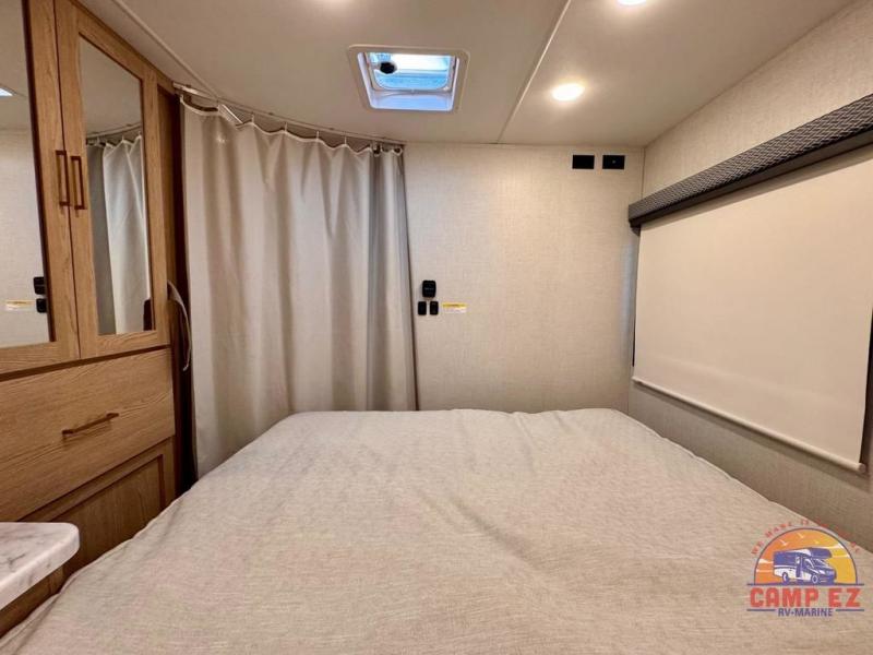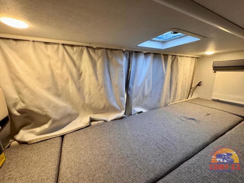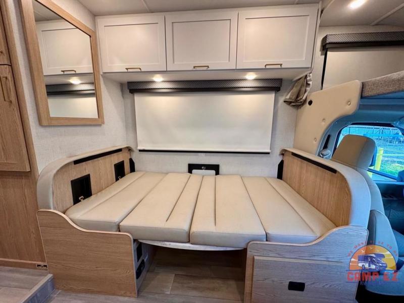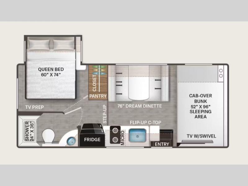 It won't be hard to find comfort in this coach for five! You can freshen up in the rear corner full bath once you've set up camp, then make lunch on the two burner gas cooktop or convection microwave with an air fryer. There is also a 12V refrigerator for cold items and a flip-up countertop for more space. Whether you dine at the Dream Dinette or take your plate outdoors under the 15' power awning, you're sure to have a great time in this motorhome. There is a semi-private bedroom with a 60" x 74" RV queen bed slide and bedroom TV prep if you want the option to watch movies in bed. And your guests can take the Dream Dinette and cab-over bunk at night!