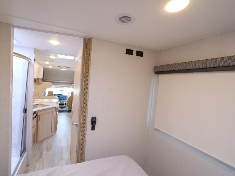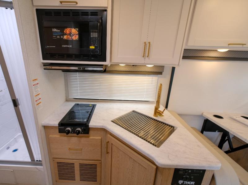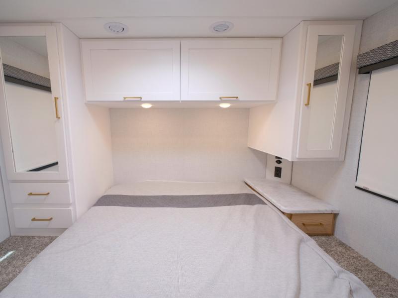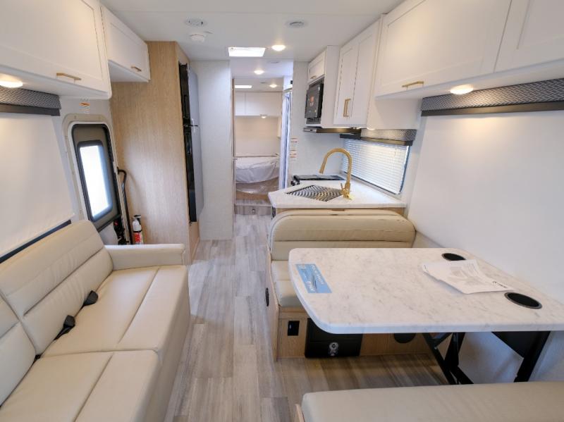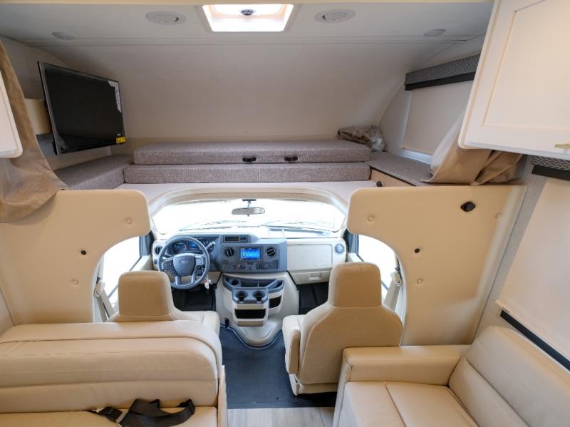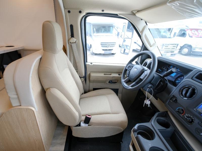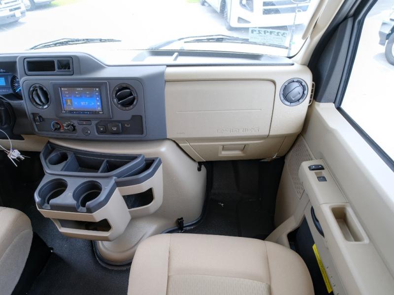 With any Four Winds ESpec Class C gas motorhome by Thor Motor Coach, you will find convenient amenities, a modern interior, and a reliable Ford E-Series chassis, with an optional Chevy chassis on select models to power your adventures. There is welded tubular aluminum roof and sidewall cage construction, a one-piece fiberglass front cap, and a one-piece domed roof membrane for added strength. Residential vinyl flooring will be easy to keep clean, and you'll love the sleek look of the Hampton Collection, two-toned cabinets. These motorhomes also include a 50 state 4.0 kW dual gas/LP generator and a 30-amp shoreline power cord to keep you going, along with a tankless water heater and 13,500 roof front A/C to ensure your comfort!