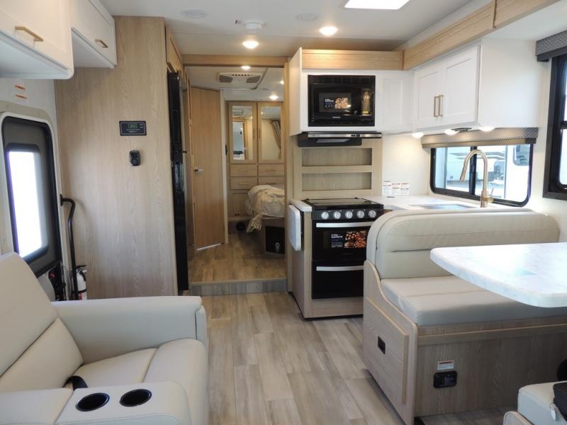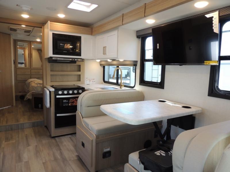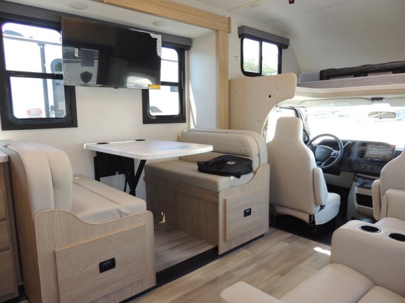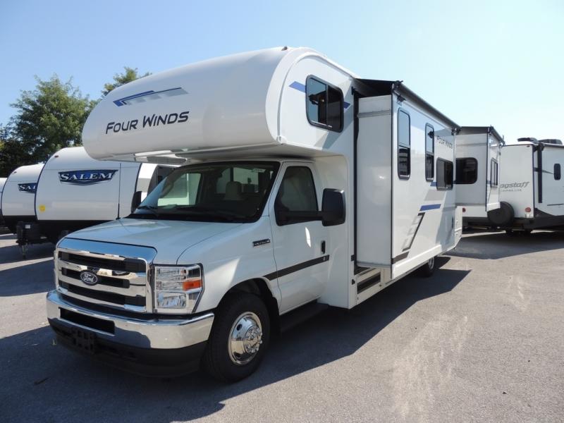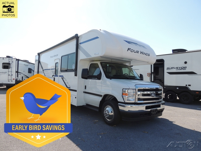 With any Four Winds Class C gas motorhome, you can travel in a trustworthy Ford E-Series chassis with 325HP, or a Chevrolet chassis with 401HP if you choose that option which is available on several models. Each is built with welded sidewall cage construction and a welded tubular aluminum roof, a one-piece fiberglass cap, and includes a slick fiberglass exterior with graphics package for style and years of enjoyment on the open road. Inside, you will enjoy the well-equipped kitchen, the spacious bathroom, the sleeping accommodations and the Winegard ConnecT 2.0 WiFi/4G/TV antenna that allows you to stay connected. With several floorplans to choose from and options to add, you will surely find one that fits your family's needs or your friend's approval. Choose today!