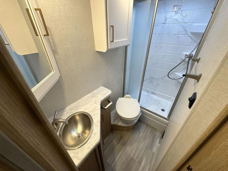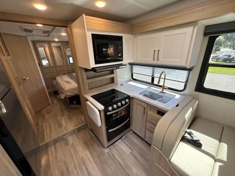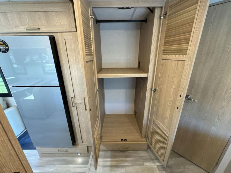 Easily head out for fun at a state park, the lake or your friend's ranch. This coach is easy to maneuver on the road or in town thanks to its compact size, yet has so many conveniences, you might not return home. The front cab over bunk is a perfect sleeping space for guests, the 40" Smart TV allows you to watch shows when you want some inside time, and the 71" Dream Dinette gives you a place to dine and relax. The cook will love all the kitchen amenities at their fingertips, plus the flip-up countertop extension is super handy. The rear corner bedroom offers a king bed slide for more floor space, a privacy curtain and a closet, plus the full bathroom is a few steps away.