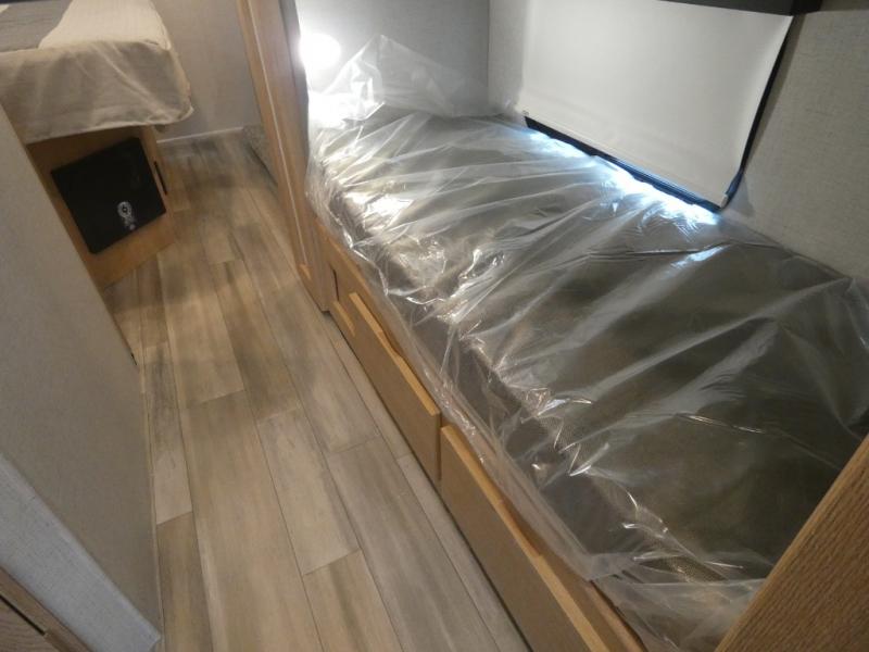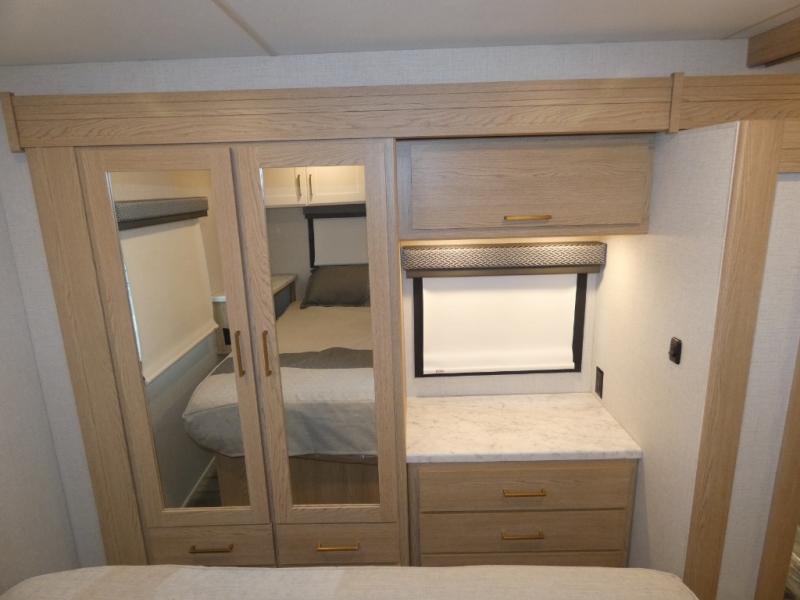 Planning a family vacation, a friend get-away or enjoy traveling with your partner? This coach offers a spacious interior thanks to the full-wall slide that stretches from behind the cab seats to the rear private bedroom. You can rest easy in your own queen bed with access to the double entry bathroom, your kids or guests will enjoy the bunk beds and cab over bunk to sleep on, plus the dream dinette and 68" jack-knife sofa offer even more sleeping space. And the kitchen amenities will impress anyone as they enter the mid-coach entrance. Everyone can watch the 40" mid-ship Smart TV in the living area, or head outside to relax under the power awning with integrated LED lighting.