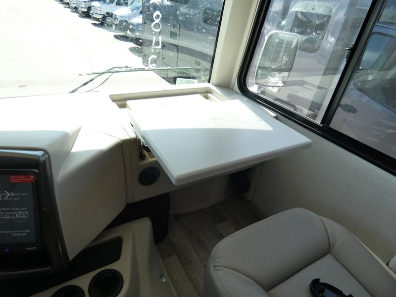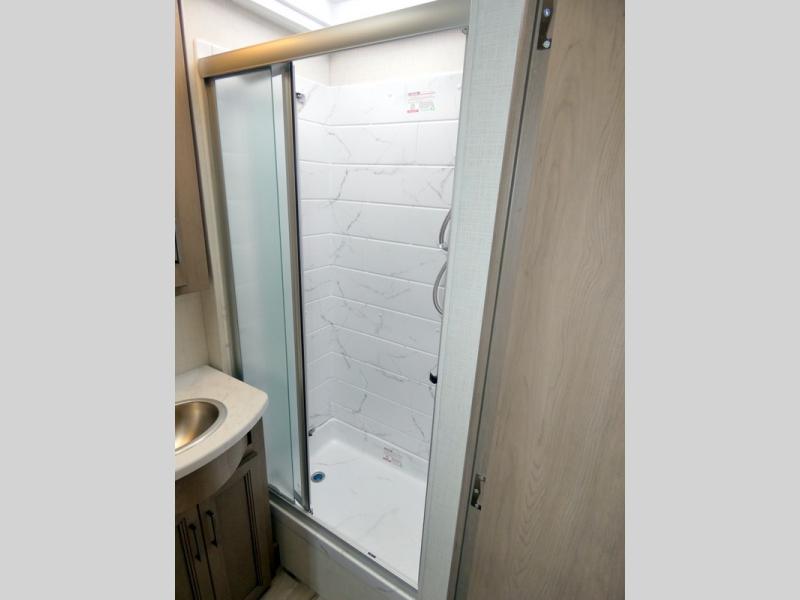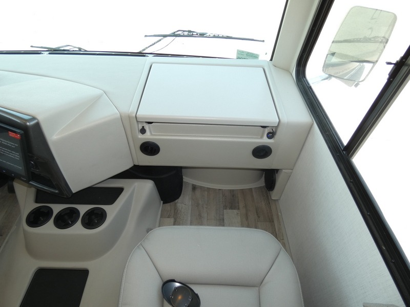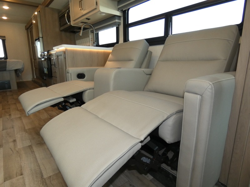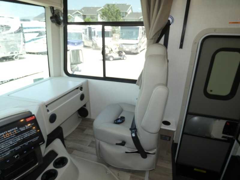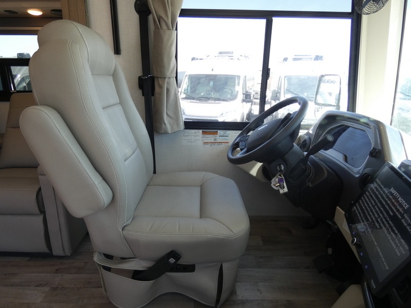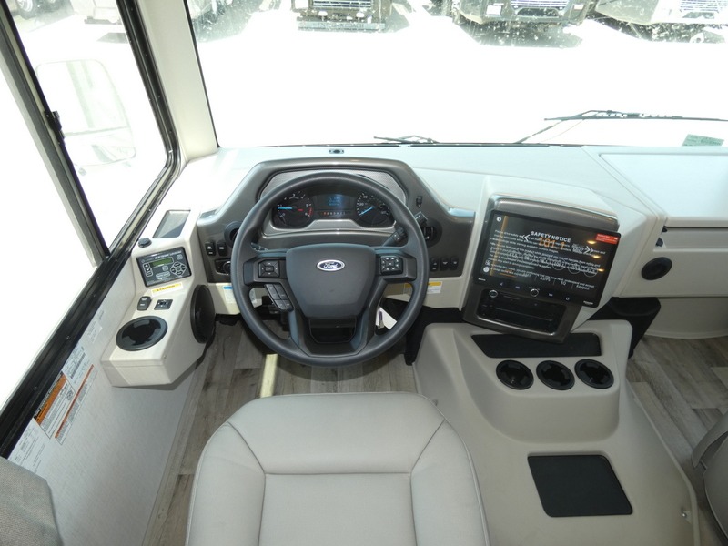 With any Hurricane Class A gas motorhome by Thor Motor Coach you will appreciate solid construction materials, like the premium one-piece Crossflex roof, welded tubular steel floor and the Vacu-Bond laminated roof, walls, and floor with block foam insulation. Each model sits on a Ford F-53 chassis with a 7.3L Triton V8 engine for power you can feel, plus there is an 8,000 lb. trailer hitch with a 7-pin round connector to pull your car along. The Rapid Camp+ multiplex system with Bluetooth will allow you to easily set up camp from the convenient 7" touchscreen provided, and the Winegard ConnecT WiFi extender +4G will let you catch up on work if needed. The Hurricane includes pressed laminated countertops inside, as well as residential vinyl flooring, decorative glass and tile backsplash in the kitchen, and many more at-home comforts.