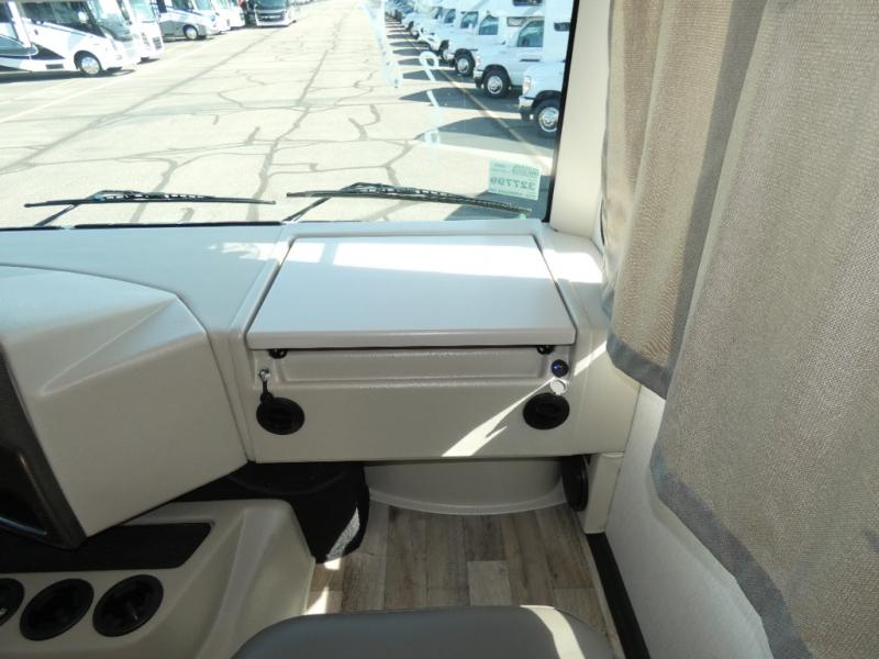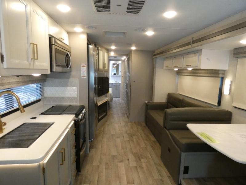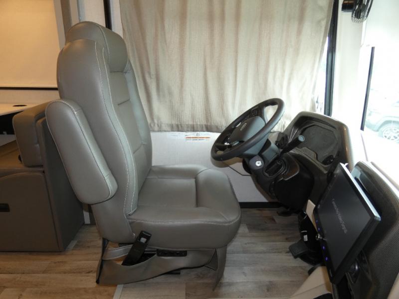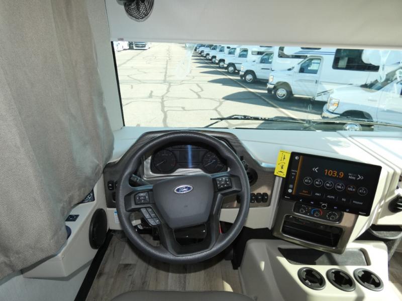 With any Hurricane Class A gas motorhome by Thor Motor Coach you will appreciate solid construction materials, like the premium one-piece Crossflex roof, welded tubular steel floor and the Vacu-Bond laminated roof, walls, and floor with block foam insulation. Each model sits on a Ford F-53 chassis with a 7.3L Triton V8 engine for power you can feel, plus there is an 8,000 lb. trailer hitch with a 7-pin round connector to pull your car along. The Rapid Camp+ multiplex system with Bluetooth will allow you to easily set up camp from the convenient 7" touchscreen provided, and the Winegard ConnecT WiFi extender +4G will let you catch up on work if needed. The Hurricane includes pressed laminated countertops inside, as well as residential vinyl flooring, decorative glass and tile backsplash in the kitchen, and many more at-home comforts.