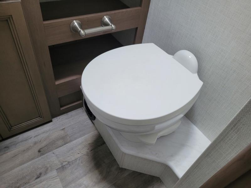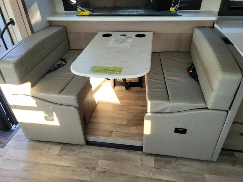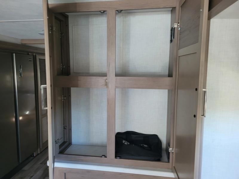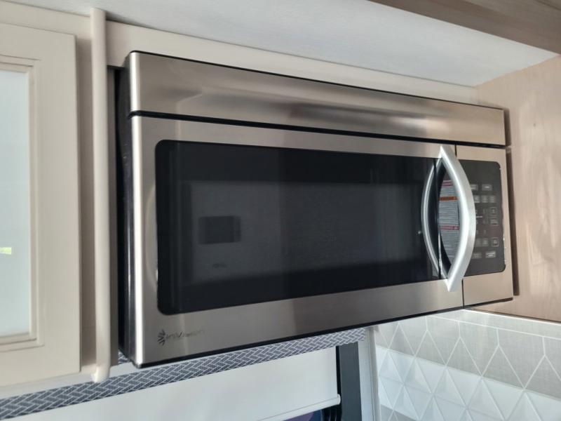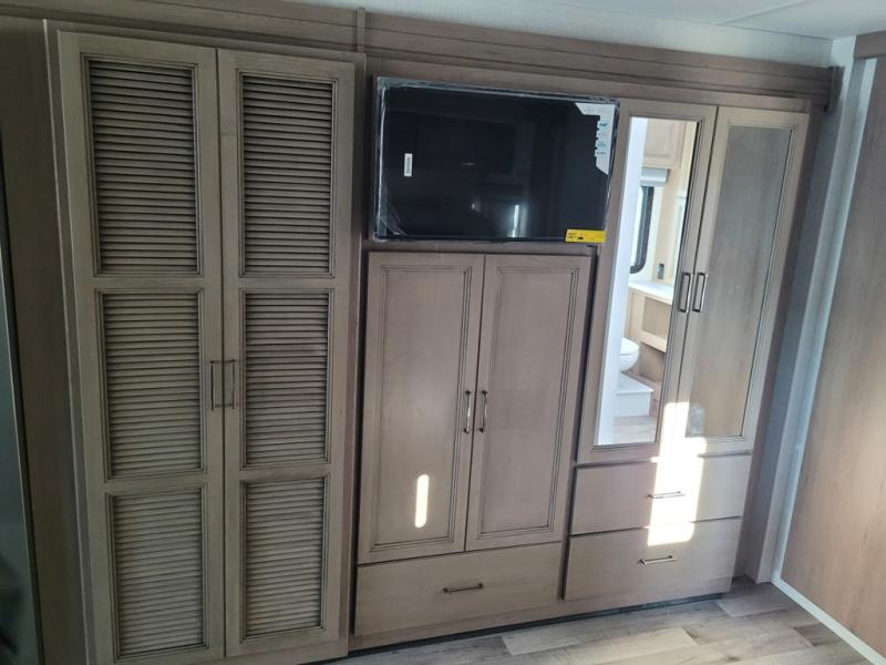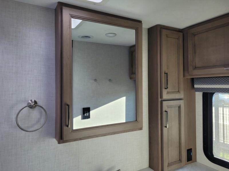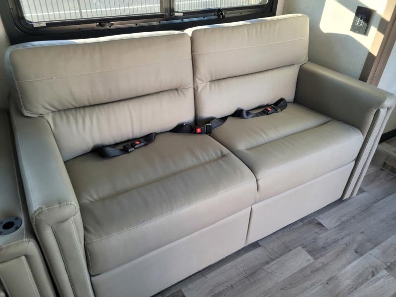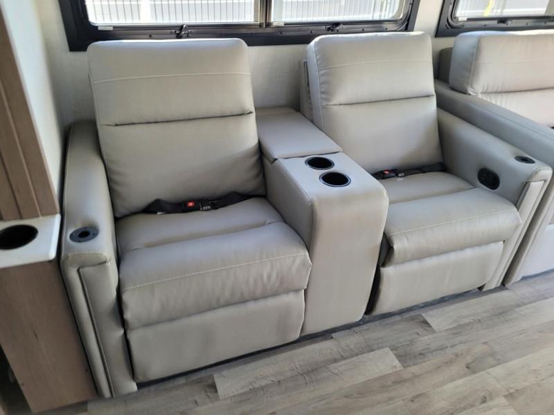 This motorhome is designed for comfort and convenience throughout. At the front, swivel cockpit chairs with a stow-away coffee table create a relaxing space for quiet mornings, while the overhead drop-down bunk offers a comfortable sleeping area for guests. The main living area features generous seating, including 68" theater seating with side tables, a 68" sofa bed, a pantry, and a cozy fireplace. Across from it, the 68" Dream Dinette is perfect for dining, games, or additional sleeping space, and a 50" LED Smart TV on a Televator provides entertainment after a day of adventure. The kitchen is well equipped with a three-burner cooktop, 30" over-the-range microwave, and a side-by-side refrigerator. A centrally located half bath adds convenience, while the rear bedroom offers a tilt a view 72" x 80" king bed in a slide-out, along with a closet, TV, and a full rear bathroom for complete comfort on the road.