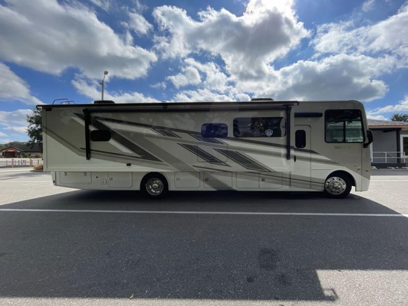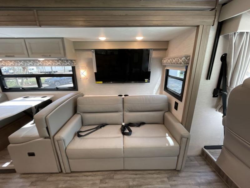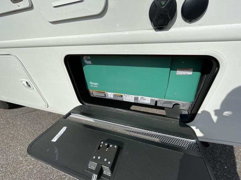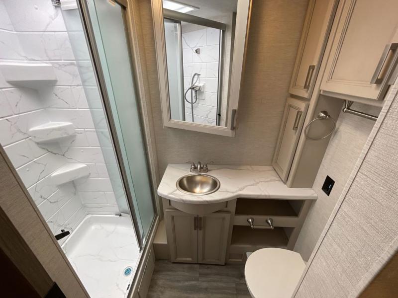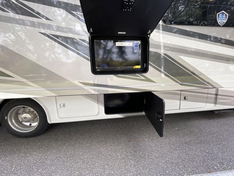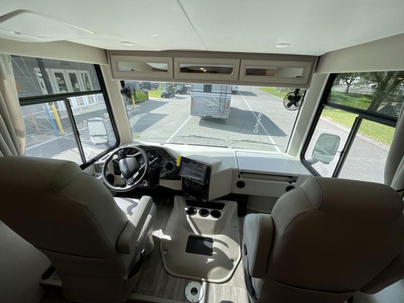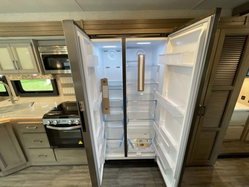 This spacious Class A motorhome has room to sleep eight! Enjoy the privacy of the rear bedroom which has a king bed, spacious closet and a 32" LED Smart TV. Extra guests can utilize the Dream Dinette, the sofa bed, or the drop-down overhead bunk which has a Cotton Cloud mattress for comfort. As if that's not enough, there's a pair of leatherette theater seats with footrests so you can kick back and watch either of the two living room TVs. You'll also find another TV outside. A full bath with 30" x 36" shower is conveniently located in the center so everyone has access, and the glass shower door and skylight make it feel roomy. The kitchen features a three-burner gas cooktop and oven, residential refrigerator, and stainless steel convection microwave.