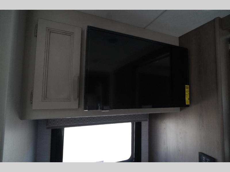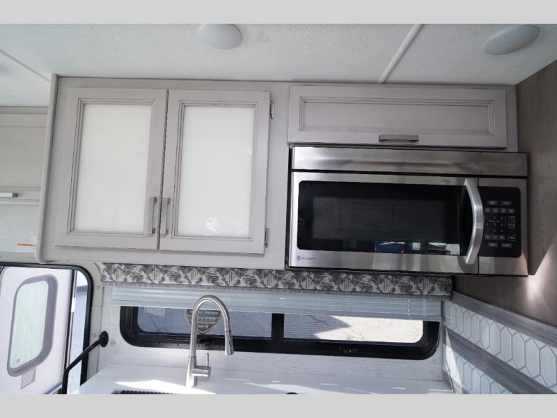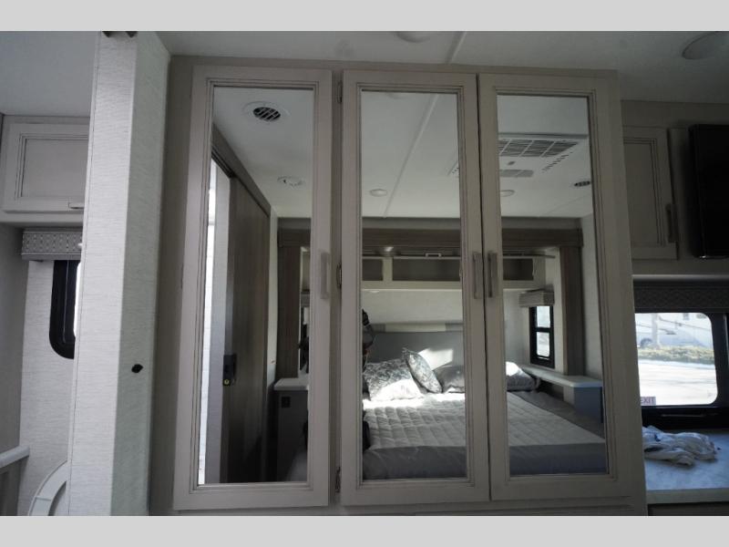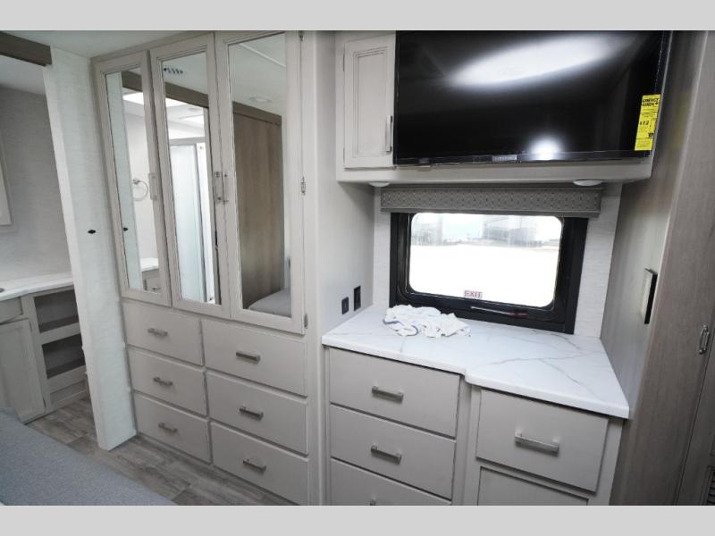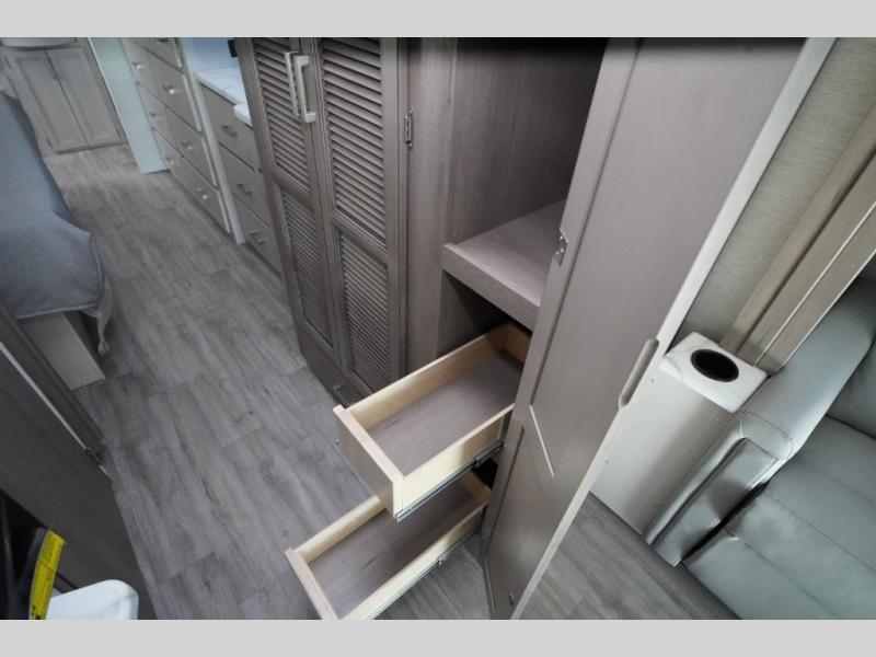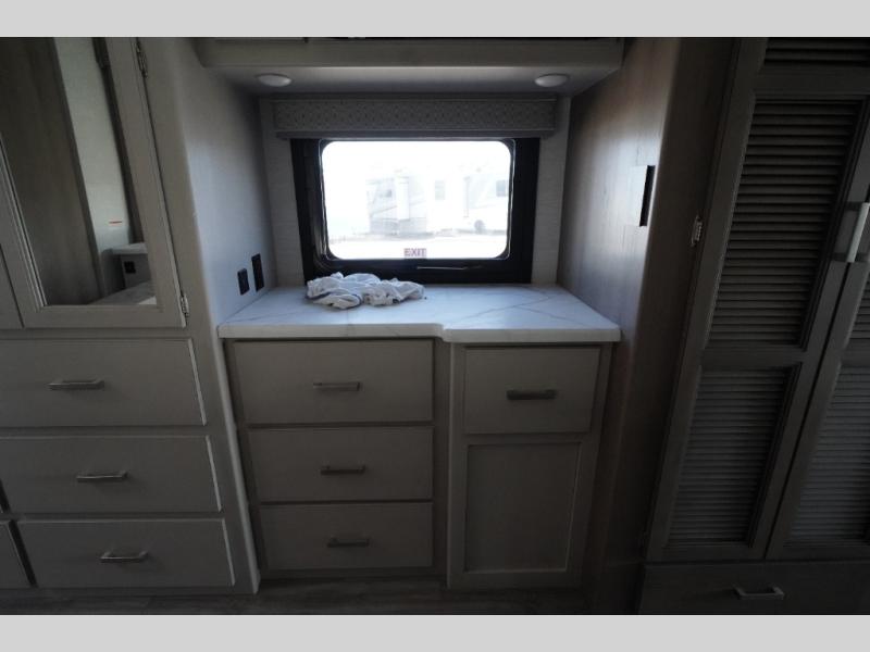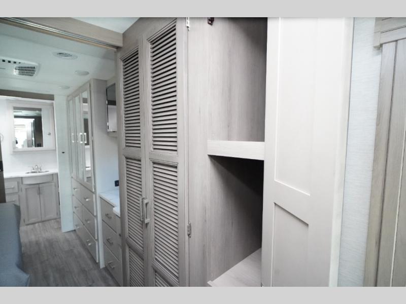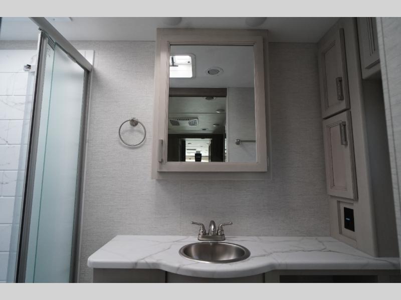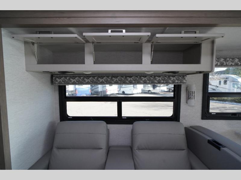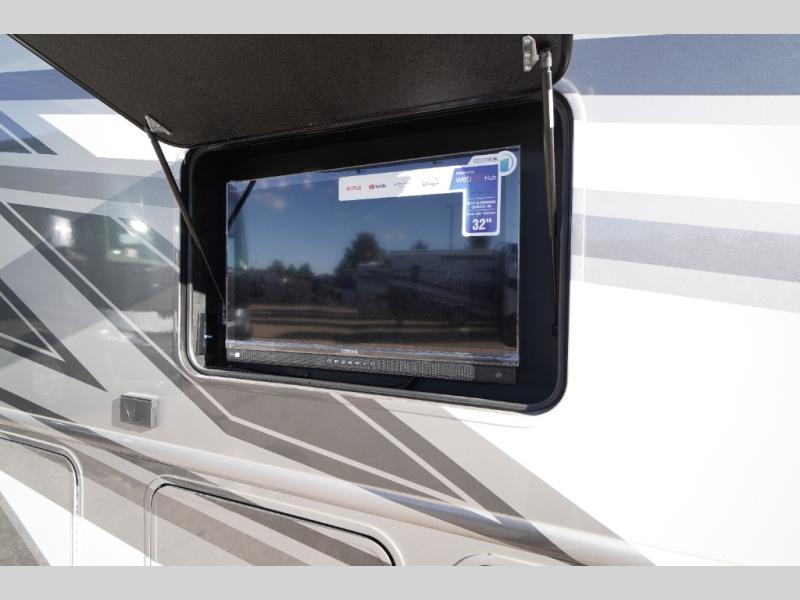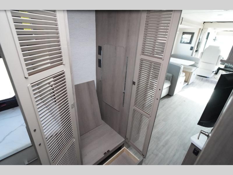 This spacious Class A motorhome has the most convenient rear bathroom! It features a linen closet, providing ample storage for towels and toiletries. The half bathroom is conveniently located, and the closet with stackable washer and dryer prep is a practical touch. You and your partner will love this motorhome’s main bedroom, boasting a spacious closet and dresser for storing essentials, a 32” LED Smart TV to enjoy your favorite shows in the comfort of your bed, which is an extremely soft king bed The kitchen is equipped with a pantry for storing snacks and ingredients, a fridge, a three-burner cooktop for culinary creativity, and a stainless steel microwave. Furthermore, in the living area, the sofa bed provides a comfortable spot to relax, while the dream dinette is perfect for meals or socializing. Additionally, the bunk over the cab provides extra sleeping space, ideal for kids or guests.