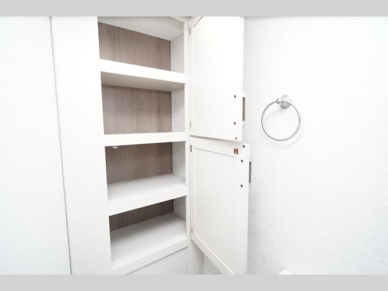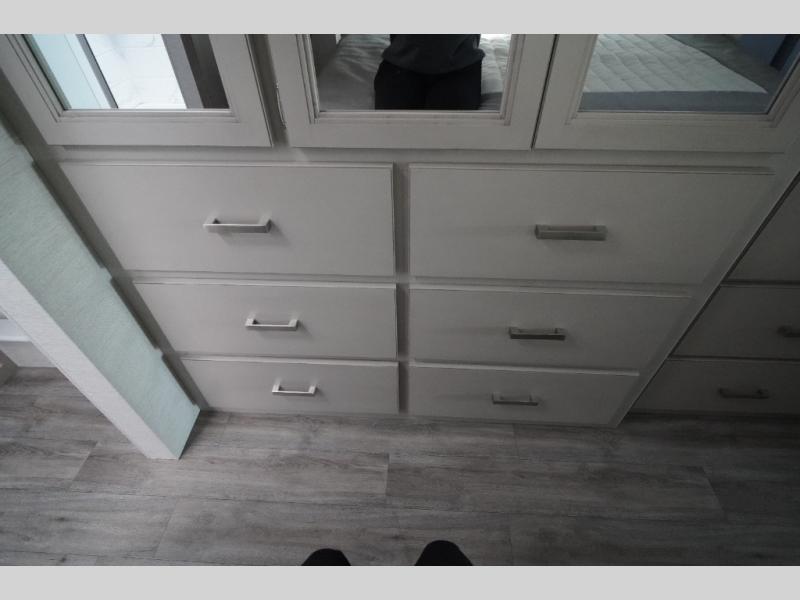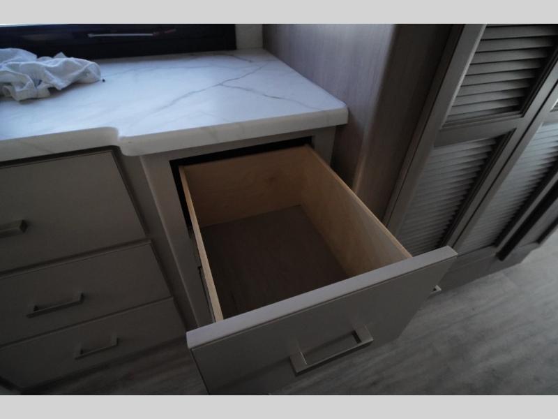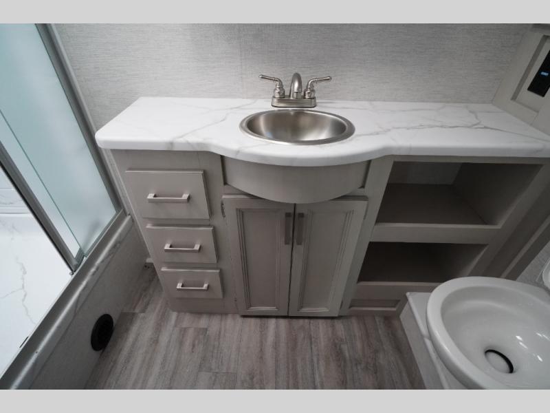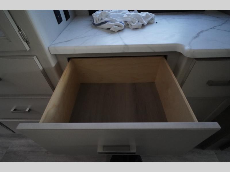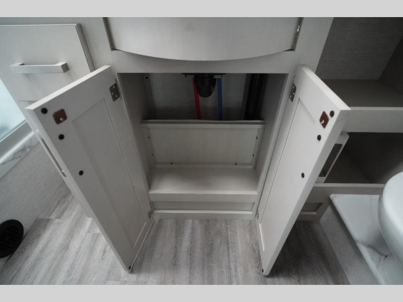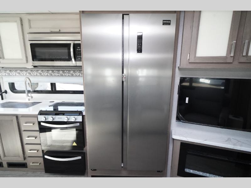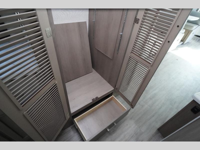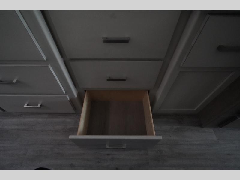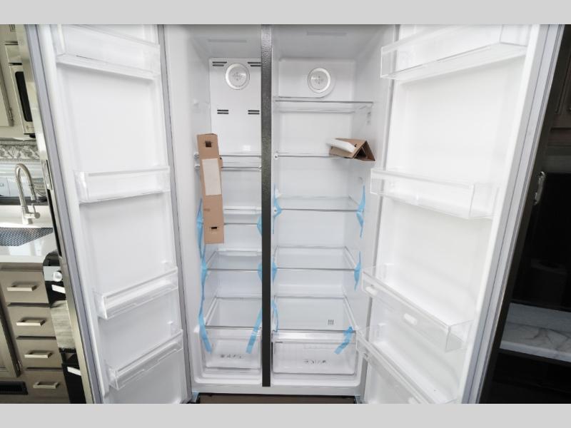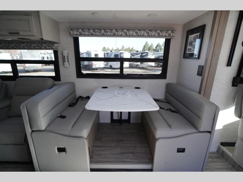 This spacious Class A motorhome has the most convenient rear bathroom! It features a linen closet, providing ample storage for towels and toiletries. The half bathroom is conveniently located, and the closet with stackable washer and dryer prep is a practical touch. You and your partner will love this motorhome’s main bedroom, boasting a spacious closet and dresser for storing essentials, a 32” LED Smart TV to enjoy your favorite shows in the comfort of your bed, which is an extremely soft king bed The kitchen is equipped with a pantry for storing snacks and ingredients, a fridge, a three-burner cooktop for culinary creativity, and a stainless steel microwave. Furthermore, in the living area, the sofa bed provides a comfortable spot to relax, while the dream dinette is perfect for meals or socializing. Additionally, the bunk over the cab provides extra sleeping space, ideal for kids or guests.