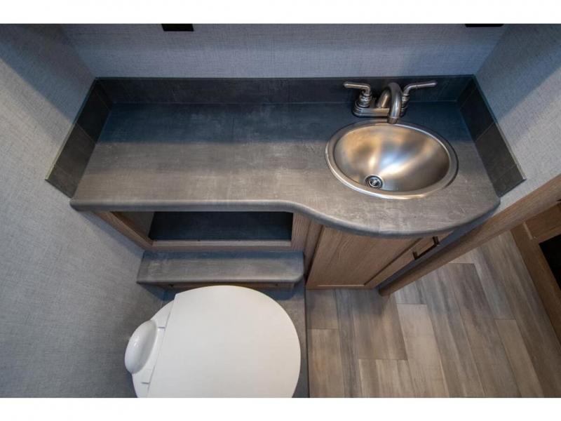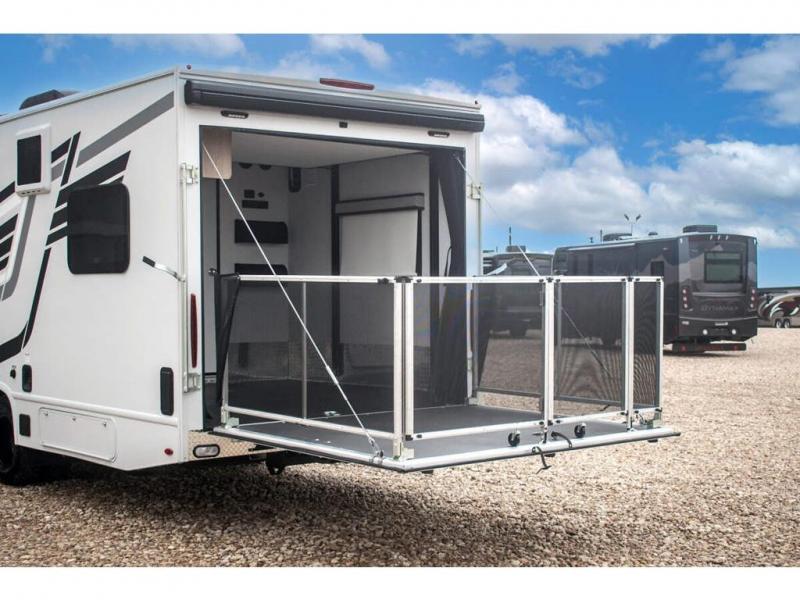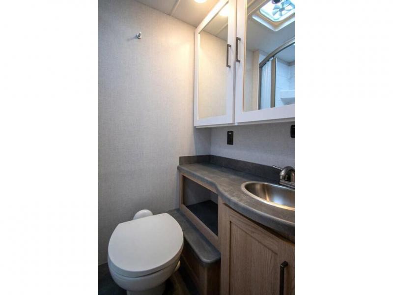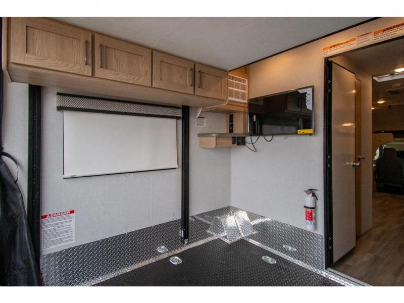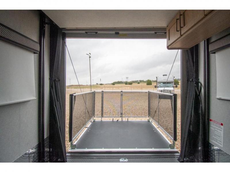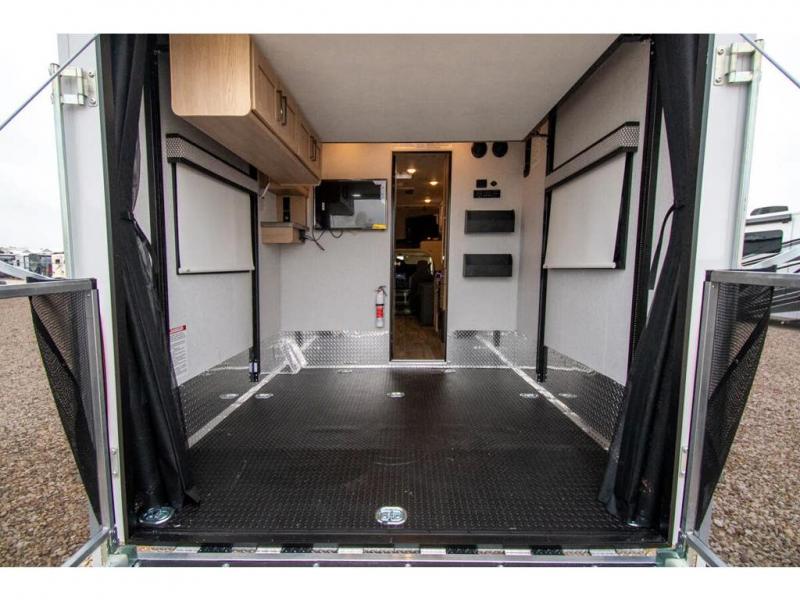 This RV measures 31 feet 1 inch in length with the new Ford chassis with a 7.3L V8 engine, SmoothTECH Suspension, slide-out, ramp door, swivel driver & passenger chairs, dual sofas and a cab over loft. This toy hauler also boasts a list of standards such as a tankless water heater, Winegard ConnecT WiFi, holding tanks with heat pads, attic fan, bug screen curtain in the garage, lighted battery disconnect switch, large kitchen sink, recessed cooktop with glass cover, fully automatic leveling jacks, large swivel TV with DVD player in the cab over bunk area, power patio awning, exterior shower, heated exterior mirrors, 3 camera monitoring system, valve stem extenders, convection microwave, flat panel TV in the garage, Onan generator and much more.
