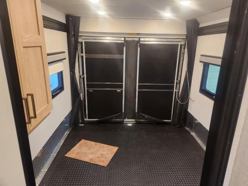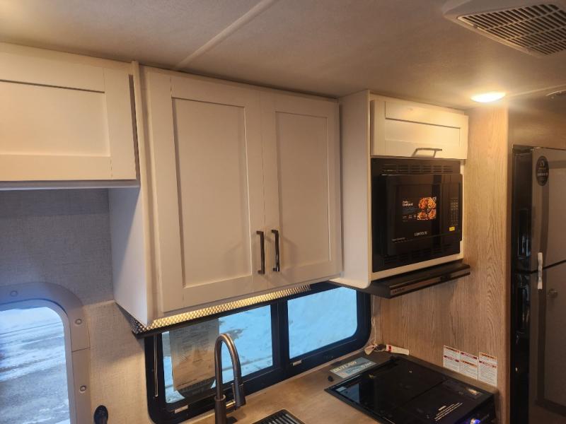 Hit the trails hard with this Class C toy hauler that includes a 8' x 10' garage with a ramp door. After you've kicked up some dirt, head back to the coach to freshen up in the split-style bath that includes a 24" x 36" shower across from the private toilet and sink. Your crew can relax on the sofa/Murphy bed you watch a movie on the 40" swivel TV in the cab-over. Cooking meals each day will be a breeze with a convection microwave oven with an air fryer and a three burner cooktop, plus there is a 12V refrigerator for perishables. You will also find plenty of storage space, including a closet within the slide out to keep your clothes tidy!