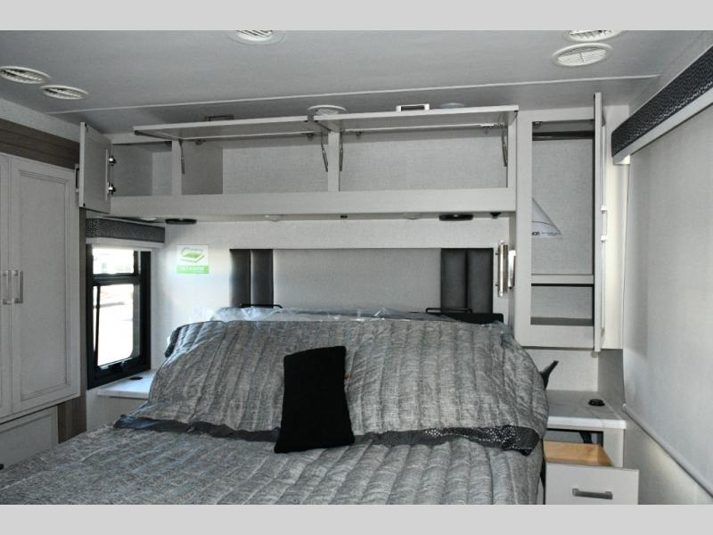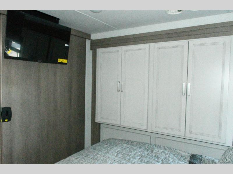 Rear Private Bedroom with Tilt-A-View inclining queen bed, closet slide, 32" LED TV, and stacking washer/dryer prep
