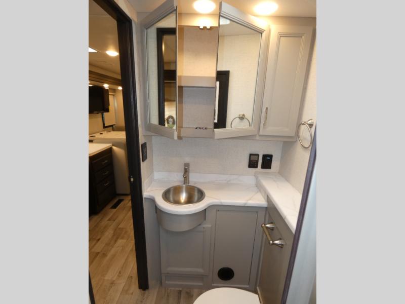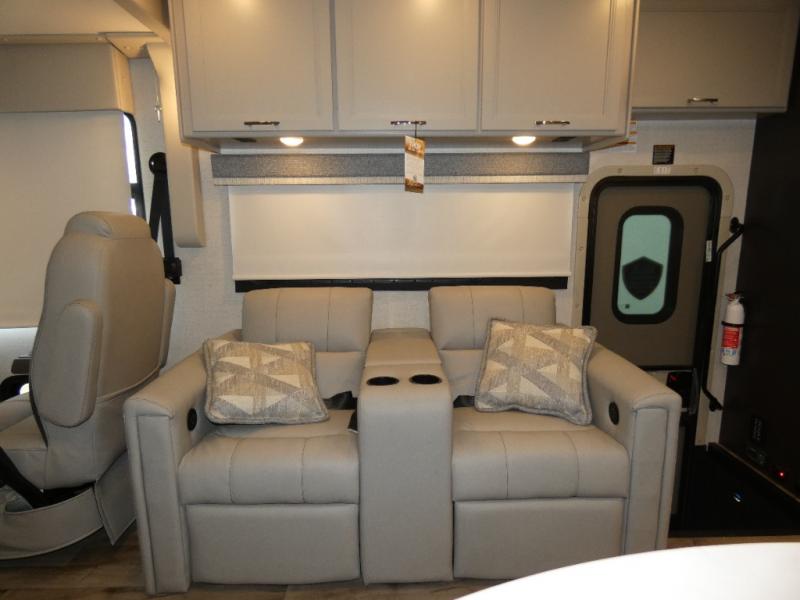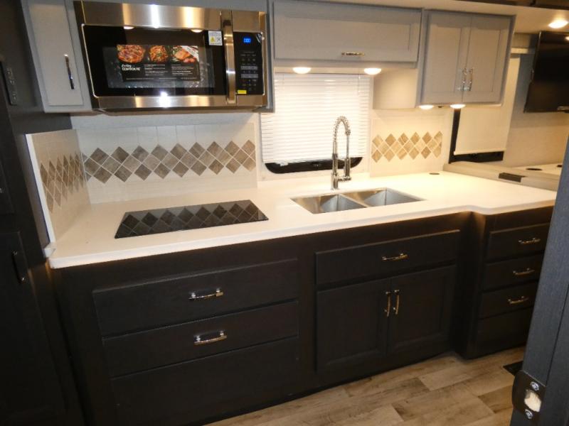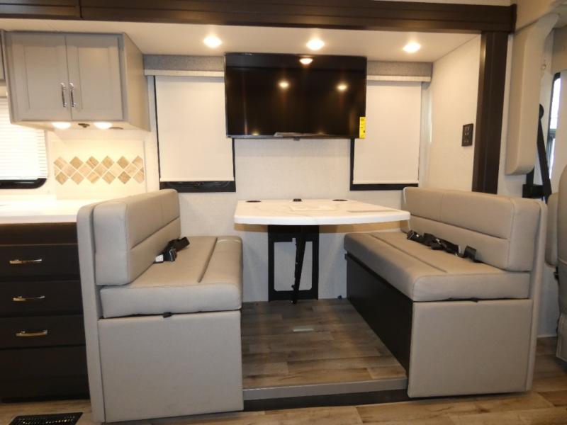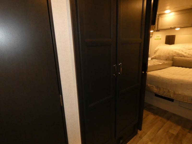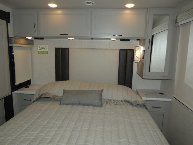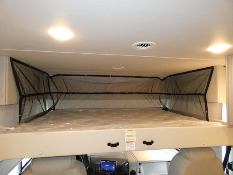 This motorhome is ready to hit the road whenever you are! The 48" x 74" bunk over cab provides sleeping space in addition to the rear private bedroom which has a Tilt-A-View inclining queen bed for a good night's rest, a closet slide, a 32" LED TV to watch your favorite movies in comfort, and an area that has stacking washer and dryer prep next to a closet and pantry. Freshen up each morning in the full bathroom with the 30" x 36" shower, and enjoy entertainment even outdoors with the outside TV!