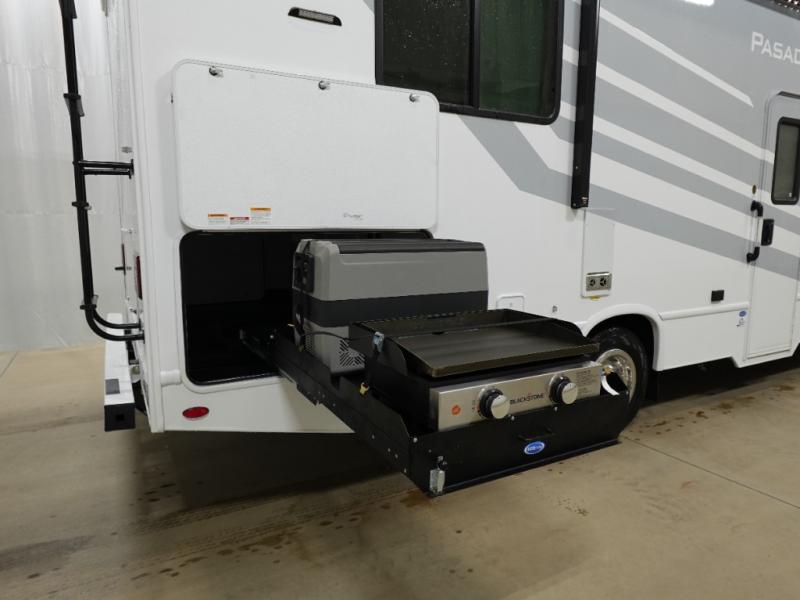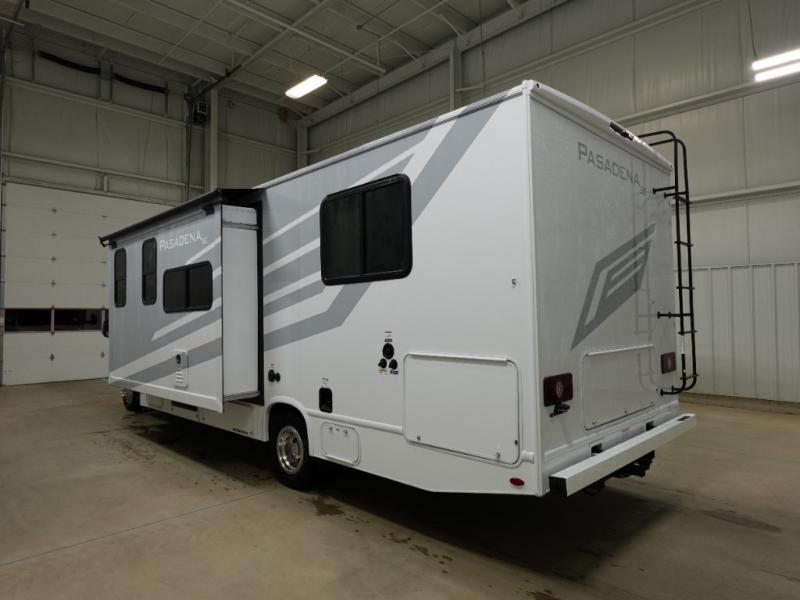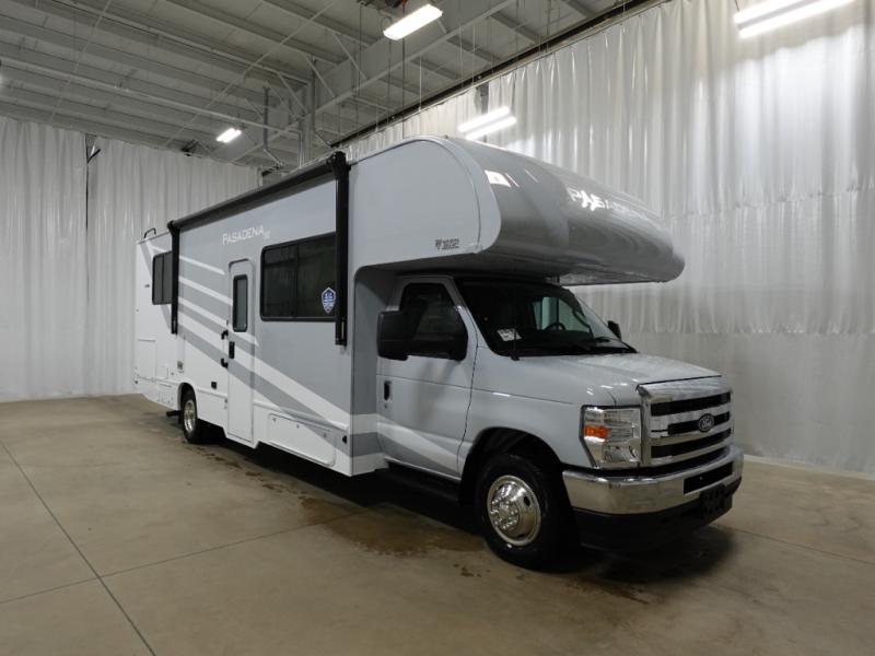With any Pasadena SE Class C gas motorhome by Thor Motor Coach, you will find convenient amenities, a modern interior, and a reliable Ford E-Series chassis, to power your adventures. There is a one-piece fiberglass front cap, and premium one-piece roofing for added strength. Residential vinyl flooring will be easy to keep clean, and you'll love the LED lighting, pressed laminate countertops throughout, and full-extensions ball-bearing drawer guides. These motorhomes also include a generator and a 30-amp shoreline power cord to keep you going, along with a tankless water heater to ensure your comfort!