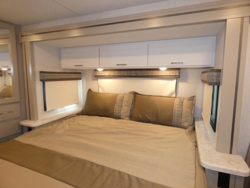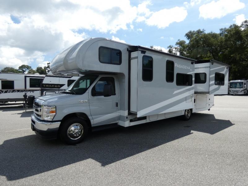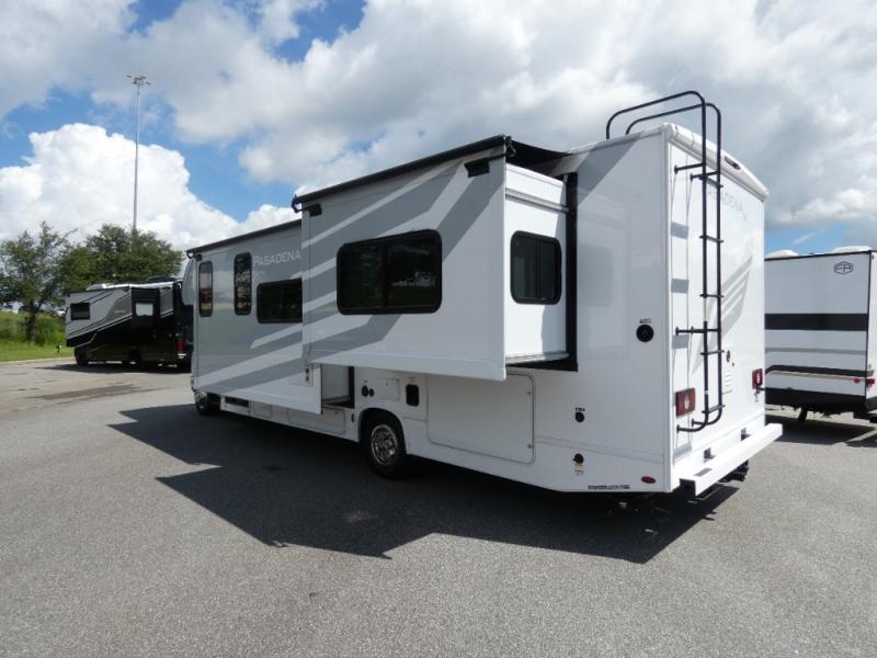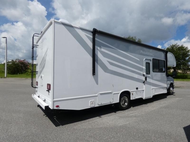 With any Pasadena SE Class C gas motorhome by Thor Motor Coach, you will find convenient amenities, a modern interior, and a reliable Ford E-Series chassis on select models to power your adventures. There is a one-piece fiberglass front cap, and premium one-piece roofing for added strength. Residential vinyl flooring will be easy to keep clean, and you'll love the LED lighting, pressed laminate countertops throughout, and full-extensions ball-bearing drawer guides. These motorhomes also include a generator and a 30-amp shoreline power cord to keep you going, along with a tankless water heater to ensure your comfort!