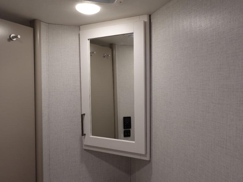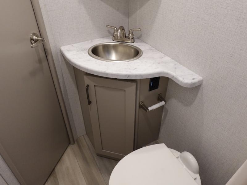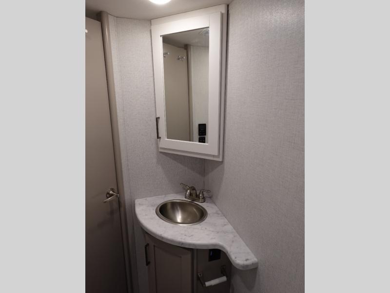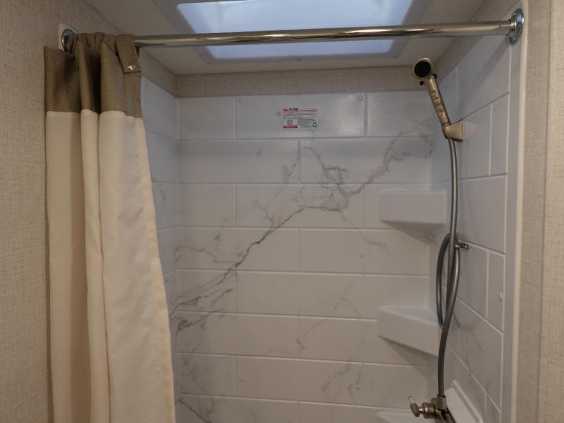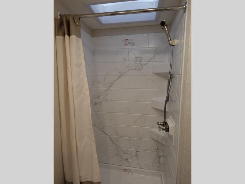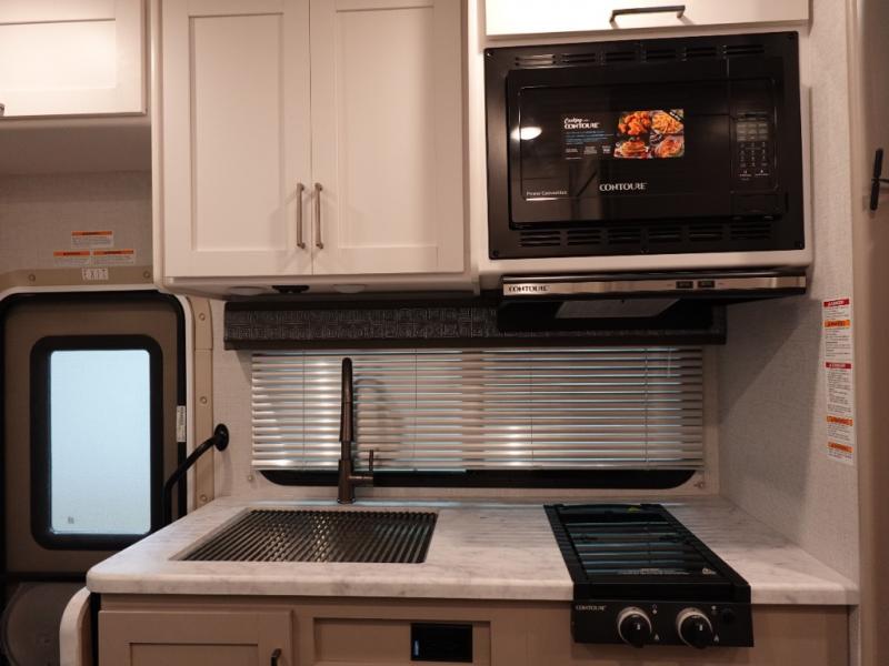 It won't be hard to find comfort in this coach for five! You can freshen up in the rear corner full bath once you've set up camp, then make lunch on the two burner gas cooktop or convection microwave with an air fryer. There is also a 12V refrigerator for cold items and a flip-up countertop for more space. Whether you dine at the Dream Dinette or take your plate outdoors under the 15' power awning, you're sure to have a great time in this motorhome. There is a semi-private bedroom with a 60" x 74" RV queen bed slide and bedroom TV prep if you want the option to watch movies in bed. And your guests can take the Dream Dinette and cab-over bunk at night!