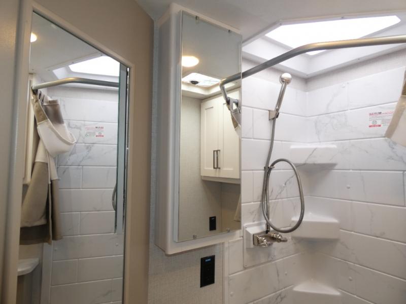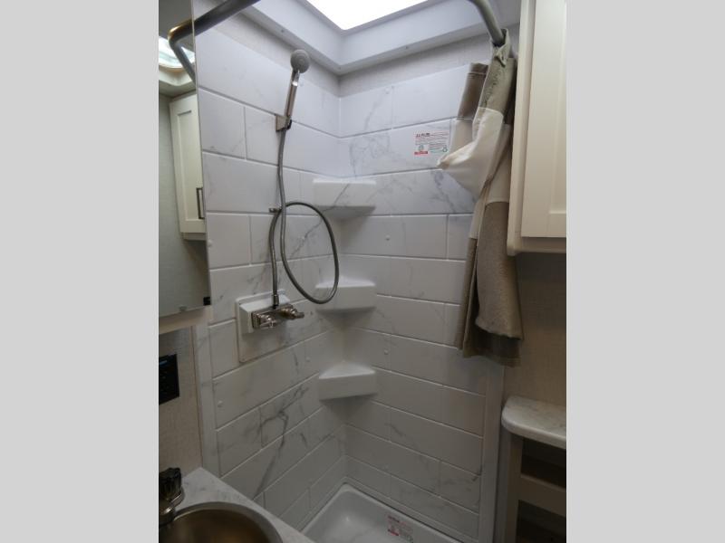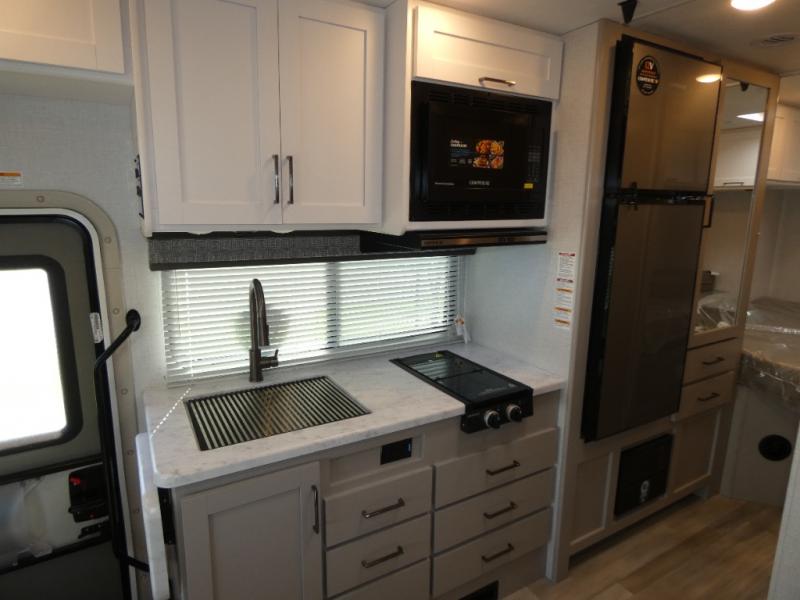 It won't be hard to find comfort in this coach for five! You can freshen up in the mid-coach full bath once you've set up camp, then make lunch on the two burner gas cooktop or convection microwave with an air fryer. There is also a 12V refrigerator for cold items and a flip-up countertop for more space. Whether you dine at the Dream Dinette slide out or take your plate outdoors under the 17' 6" power awning, you're sure to have a great time in this motorhome. The semi-private rear bedroom includes a privacy curtain, two twin beds with a king-size bed conversion, plus TV prep if you want the option to watch shows in bed. And any guests you may have can sleep on the dinette and 52" x 96" cab-over sleeping space!
