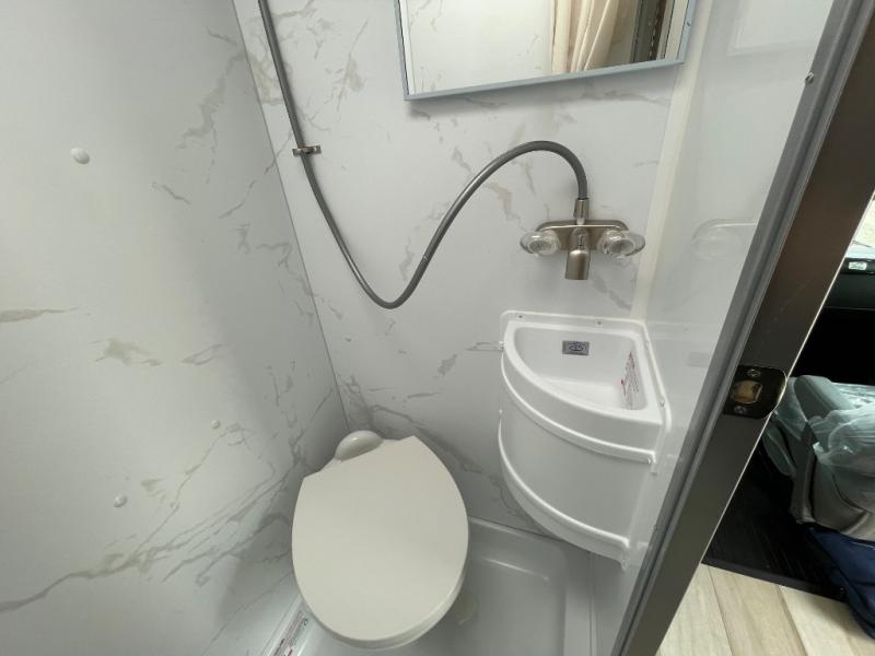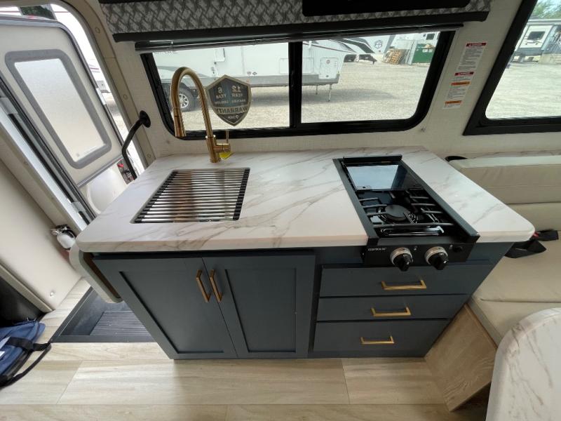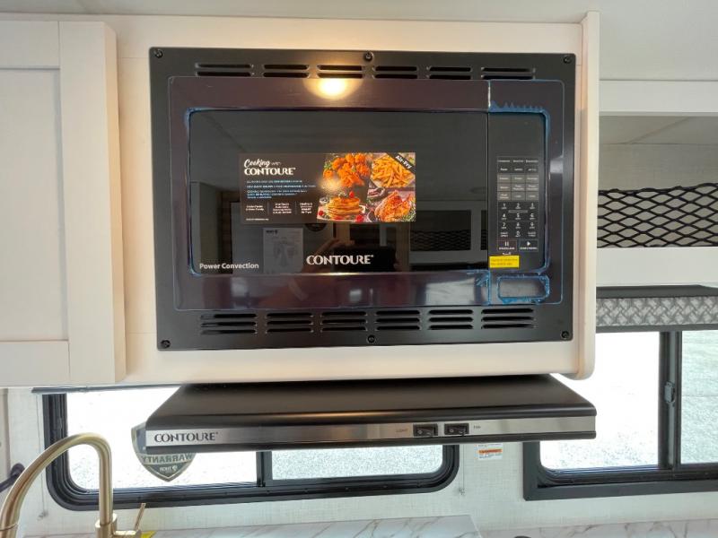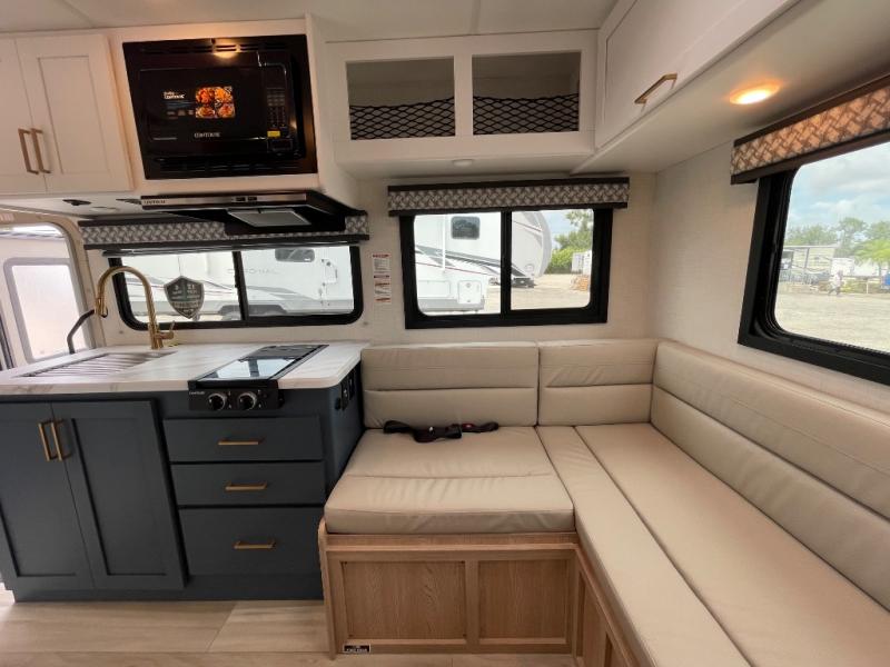 This compact, yet cozy coach is perfect for trips to the campground each weekend! Once you've reached your destination, you can set up the 11' power awning, unload the exterior storage compartments, and relax in your camp chairs. The two burner gas cooktop and convection microwave with an air fryer will let you make meals each day, and there is a 12V refrigerator to keep food fresh. A flip-up counter is another great feature that will give you more prep space! You can freshen up in the wet bath, grab your night clothes from the closet, then convert the U-shaped dinette into a 54" x 77" bed for a great night's rest!
