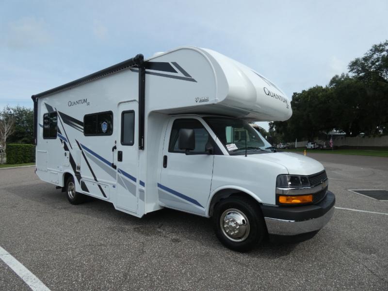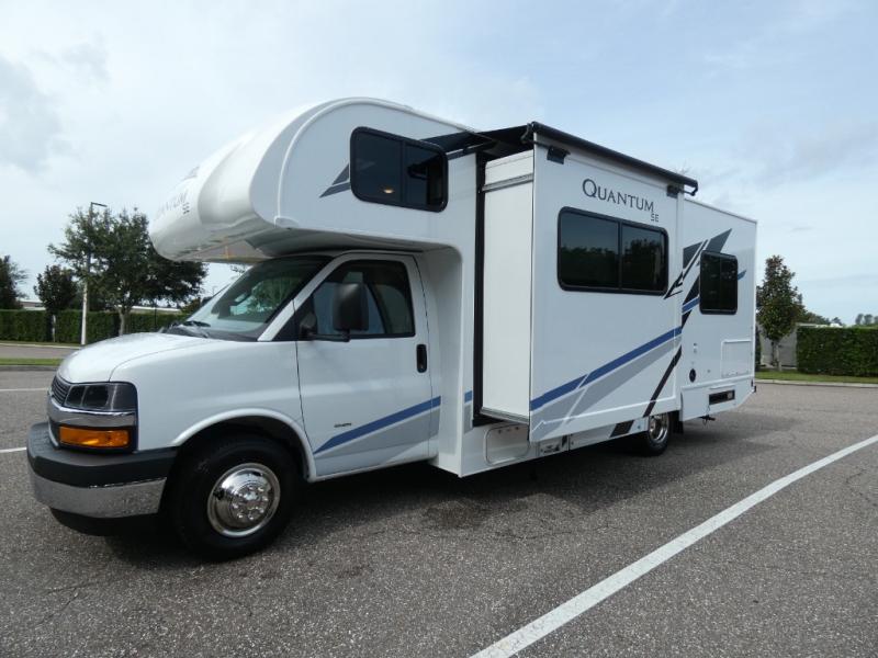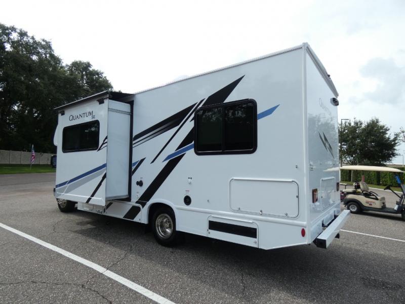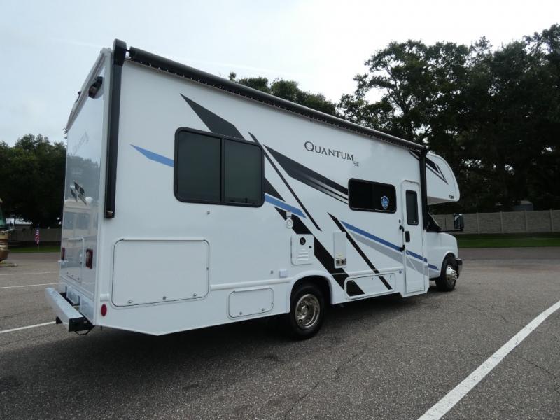 Each Quantum SE is constructed atop a durable Ford E-Series chassis or a Chevy chassis on select models. A one piece fiberglass front cap and slick fiberglass exterior with a graphics package provide a stylish appearance that is easy to maintain for years of family travel, plus there is premium one-piece roofing for added durability. You will also love backup monitor and dash radio with Bluetooth to listen to your favorite tunes as you travel down the interstate. Each unit provides a power awning with integrated LED lighting and lighted rotocast storage compartments so you can easily find what you need even after dark. The on-board 4.0 kw gas generator and 30-amp shoreline power cord will keep your adventures powered up, and the tankless water heater will be a feature you won't want to camp without. Why not make one of these Quantum SE models your new traveling home-on-wheels.
