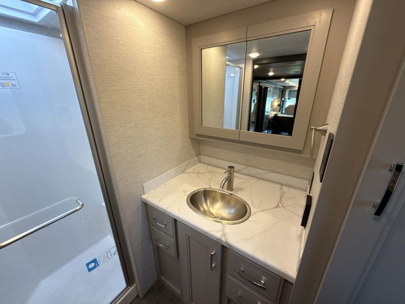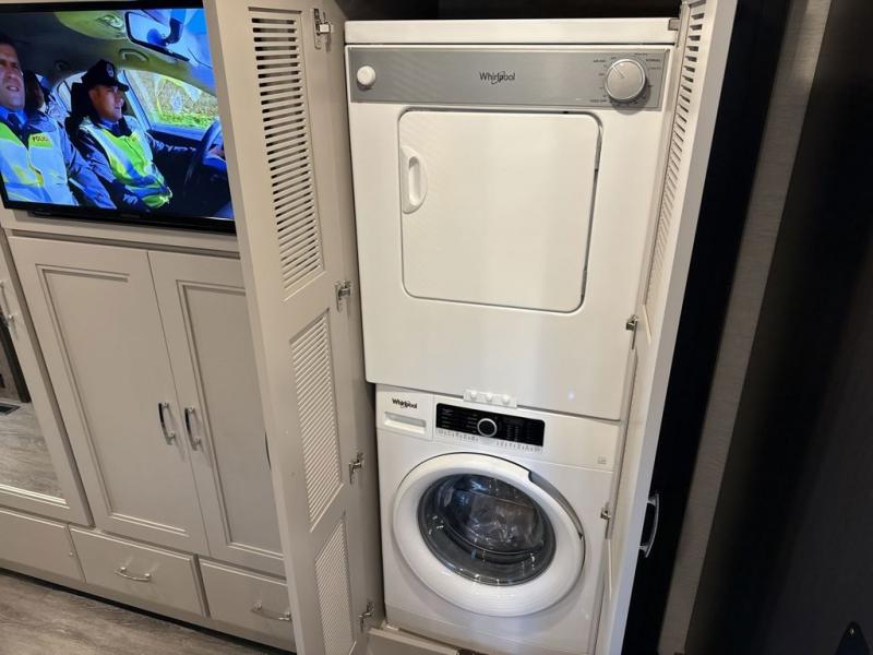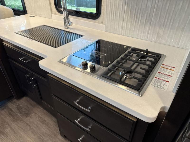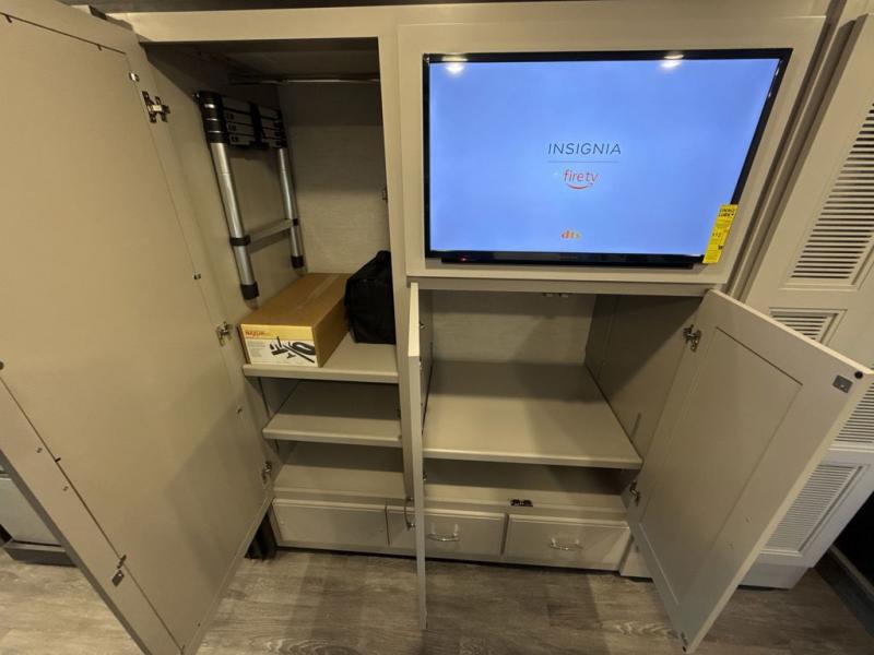 If you're traveling and camping with friends and family, this coach is sure to come in handy with its triple slides and a bath and a half! Once you arrive at the campsite, set up the 20' power lateral arm awning with LED lights, unpack your gear from the pass-through storage, and watch the game with the exterior 40" LED TV. If you'd rather enjoy some time inside, you'll find the 68" theater seating across from the 50" TV to be accommodating, plus there is a 68" sofa and a 72" Dream Dinette for more seating space! This Riviera kitchen includes a pull-out countertop for more prep space, a two burner electric induction cooktop, plus a pantry and a 15.7 cu. ft. French Door residential refrigerator for food storage! When you're ready to turn in for the night you'll enjoy the Tilt-A-View inclining king bed across from a 32" LED Smart TV, and the full rear bath with ample space to get ready for bed!