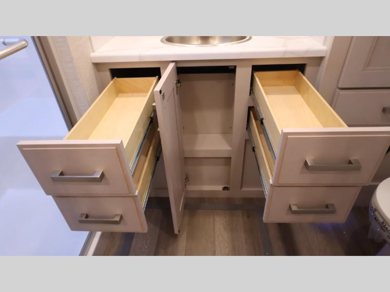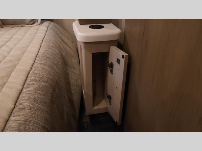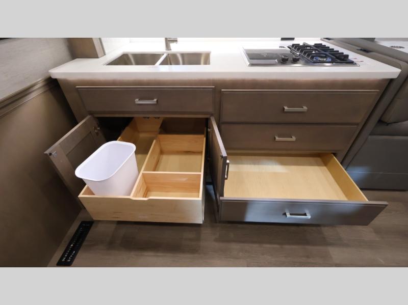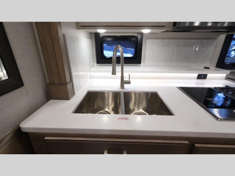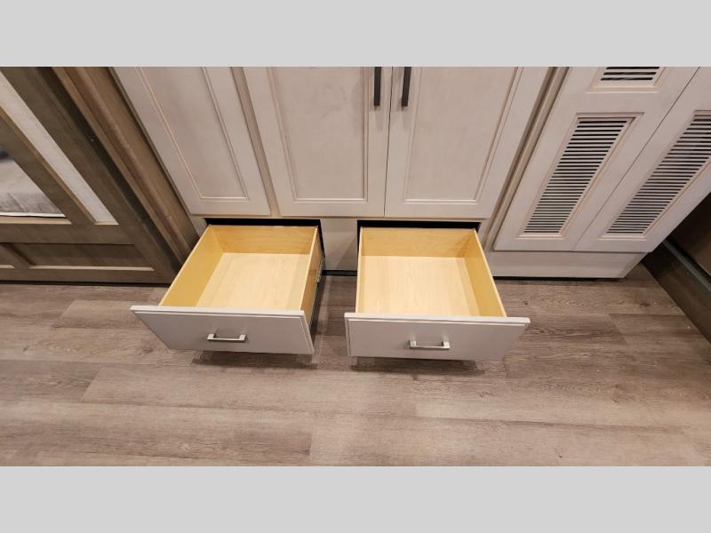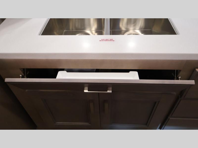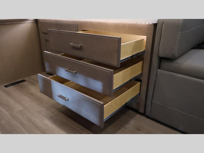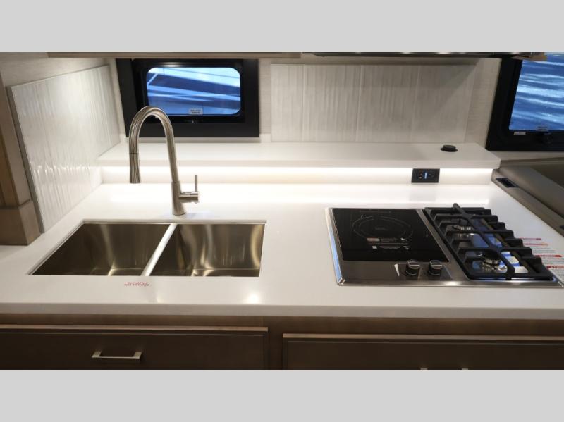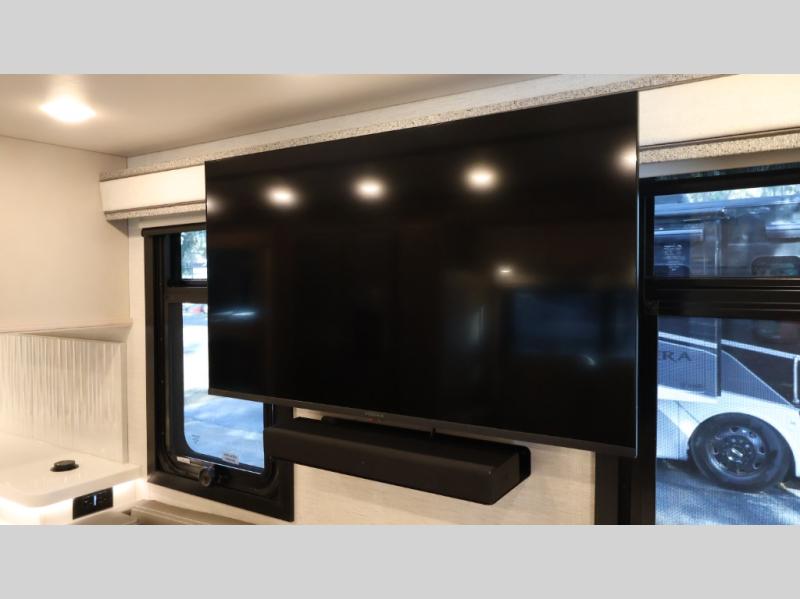 This coach can fit your whole crew thanks to the added bunk beds within the full-wall slide! There is also a drop-down overhead bunk, a Tilt-A-View inclining queen bed, a 72" Dream Dinette, and an 80" sofa for even more sleeping space! A full rear bath on board will let you clean up each morning, and there is a second full bath across from the bunks for your guests; how convenient! Head to the kitchen to prepare breakfast on the two burner electric induction cooktop or in the stainless steel over-the-range convection microwave, and there is a 19 cu. ft. side-by-side residential refrigerator where the milk and eggs can go back in. After a day outdoors relaxing under the 20' power awning and watching the game on the exterior 40" LED TV, you can head indoors to play a game at the Dream Dinette or get cozy with a book on the sofa!