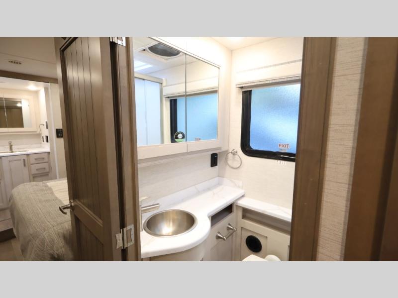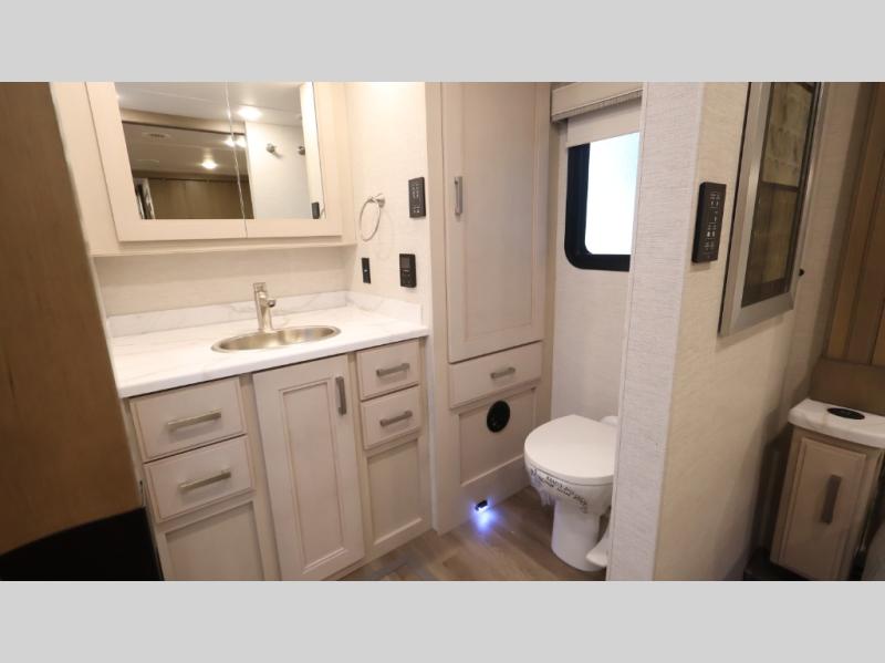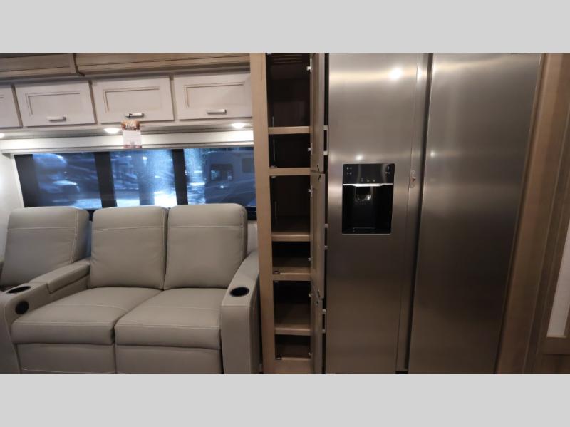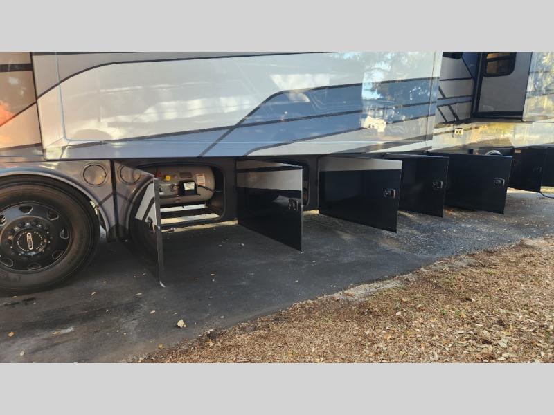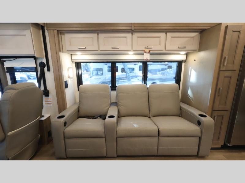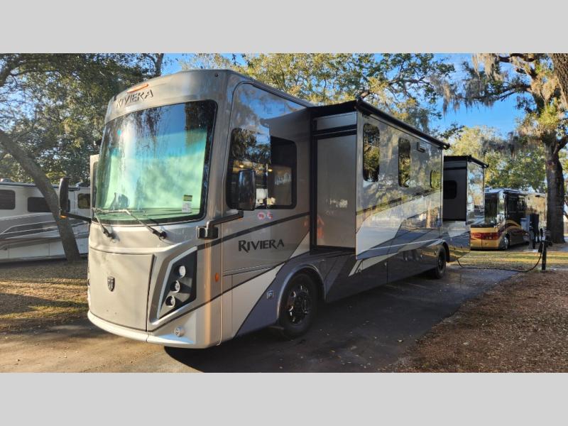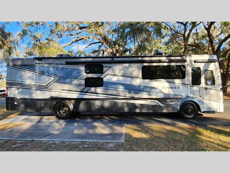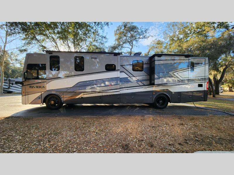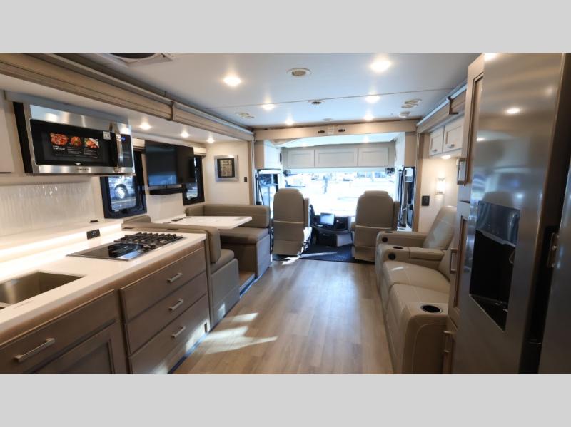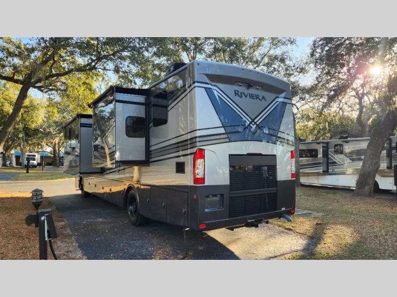 With any Riviera Class A diesel motorhome by Thor Motor Coach, you will enjoy a luxury home on wheels wherever you decide to roam! You will appreciate a capable Freightliner CS-S straight rail chassis with an Atlas foundation and better fuel mileage with the Cummins ISB-XT 6.7L diesel engine. There is a spacious basement pass-through storage for your camp gear, a powered patio awning with LED lighting, and an exterior 40" LED TV for outdoor movie nights. You will be able to enjoy your coach for years to come thanks to the durable construction materials that include a welded tubular steel floor, Vacu-Bond laminated roof, walls, and floor, plus a one-piece domed roof membrane. The elegant interior is designed with luxury vinyl tile flooring, "Wyndham" cabinetry with “Rake” style cabinet doors & nickel finish hardware. Some of the amenities you'll appreciate on each model include the RapidCamp+ multiplex wiring control system, a tankless water heater, and an Onan RV QD 6000 diesel generator. Enjoy your RV life with a Riviera Class A diesel coach!
